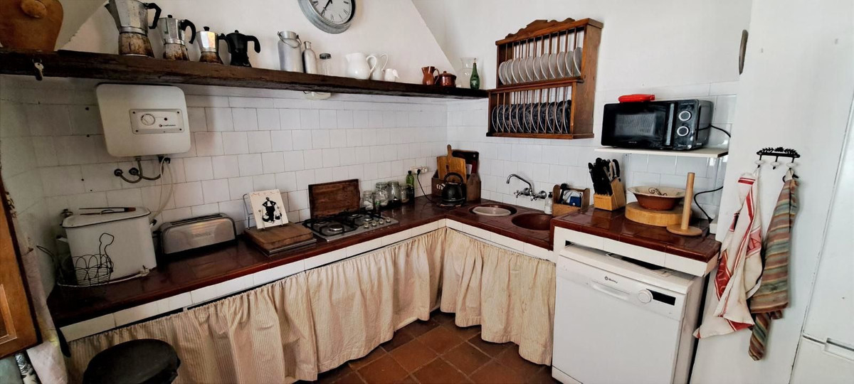 The living room, measuring approximately 45m², is spacious, bright and features many beautiful details. The windows and double doors offer stunning views of the valley below, and there is a spacious outdoor terrace where you can enjoy the Spanish countryside. The living room also has wooden ceiling beams, beautiful flooring and a large fireplace. For convenience, a pellet stove has been installed for the cooler winter months.