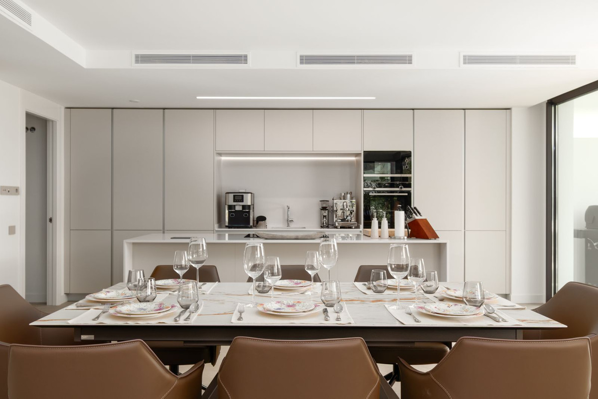 The elegant living-dining area flows seamlessly into the open-plan designer kitchen, creating a welcoming atmosphere for a sophisticated lifestyle and convivial moments. From here, you have access to spacious terraces with pleasant views over the garden, the pool, the golf course and, in the distance, the mountains. In addition, there is a private solarium. All of this invites you to make the most of the Mediterranean climate. Two private parking spaces complete the offer.