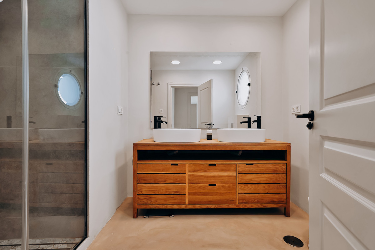 Upstairs, the master suite features a stylish ensuite bathroom, a spacious walk-in closet, and a large terrace with stunning sea views. On the garden level, three additional bedrooms and two bathrooms open to a private garden also overlooking the Mediterranean. This floor is completed by a cinema room, storage space, and a laundry room – ensuring both comfort and practicality.