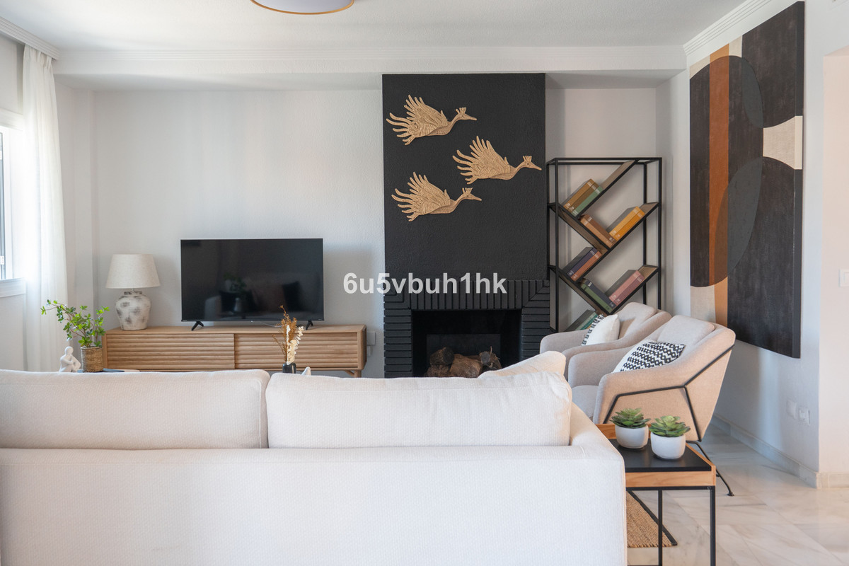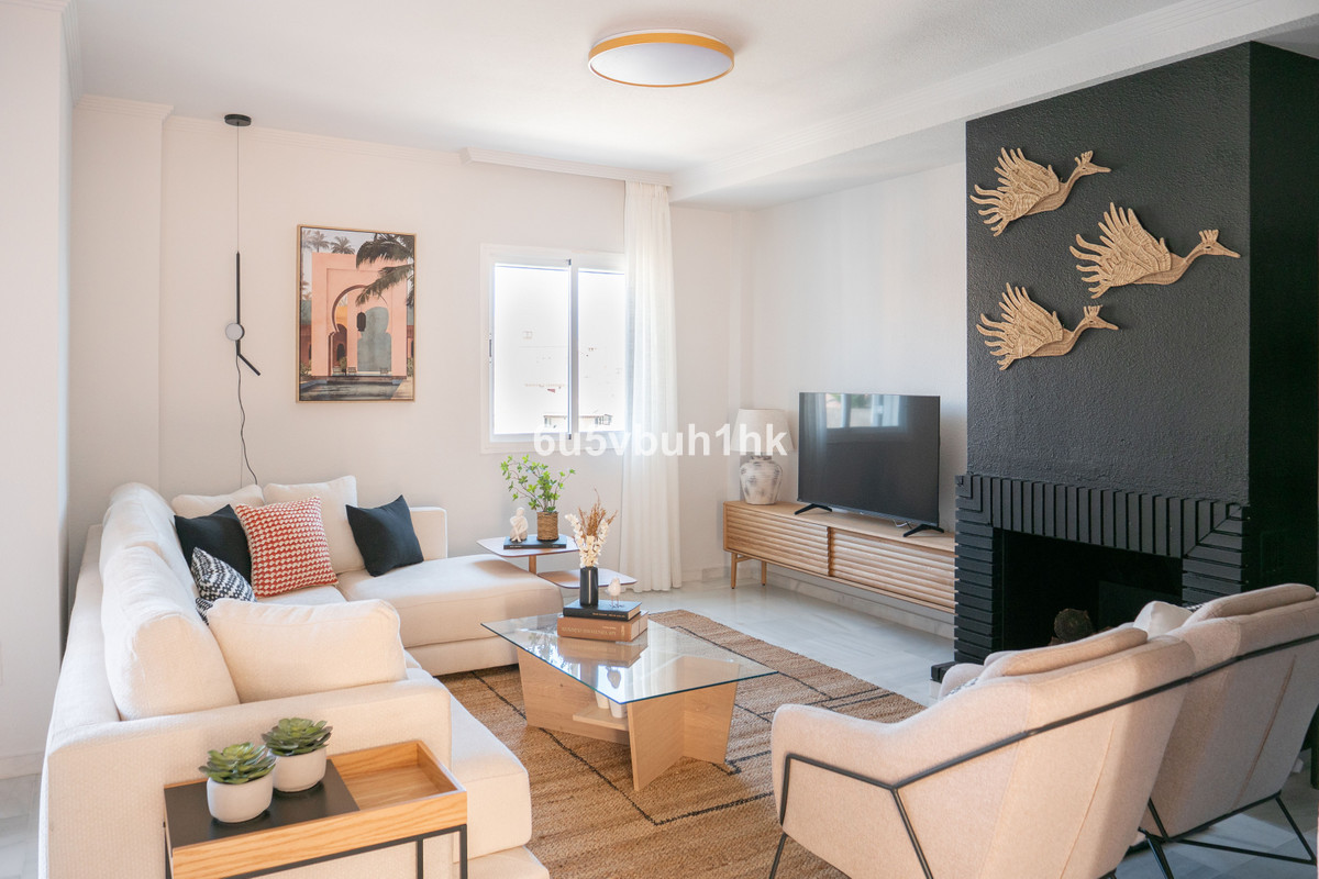 Some homes just have that special feeling, and this is one of them.Set within a gated community with gardens and a swimming pool, this corner townhouse perfectly combines the charm of its original architecture with a fresh, elegant renovation. It’s the ideal family home, yet also a smart investment: demand in Torrequebrada is so strong that it could be rented out for long-term stays almost immediately after purchase.The location is simply unbeatable. We’re in Torrequebrada, one of Benalmádena’s most desirable residential areas — quiet, well-connected, and just a short walk from the beach. Around the corner, you’ll find Mercadona, cafés, restaurants, bakeries, pharmacies, beauty salons, and all kinds of local shops. Here, daily life is effortless, no need to drive anywhere.Families will love the area for its excellent schools, both local and international. The Torrequebrada International College offers bilingual education and the International Baccalaureate program, while The Benalmádena International College follows the British curriculum from early years through sixth form.From the community, there’s also quick and easy access to the beach, without the summer traffic.The house is laid out comfortably across just two floors and includes direct access to a private garage with space for two large cars and room for a motorbike or bicycles.On the main floor, the spacious living room with a cozy fireplace sets the tone, warm, welcoming, and full of light. The dining area opens onto a large terrace with sea views, beautifully furnished for relaxing evenings, outdoor meals, or simply keeping an eye on the kids at the pool below. The modern kitchen, with its central island, is both functional and stylish, creating a natural flow that makes this floor feel like the true heart of the home.Upstairs, there are three generous bedrooms and two bathrooms. The main bedroom features an elegant en-suite, morning sun from its east-facing position, and views of the sea. Every bedroom is thoughtfully furnished and tastefully decorated, with study desks, soft lighting, hand-stitched cushions, and calming neutral tones.This home is all you've been looking for and ready to move into. It combines everything you need: location, comfort, style, and excellent long-term value.An extraodinary opportunity not to be missed. We’d love to show it to you.