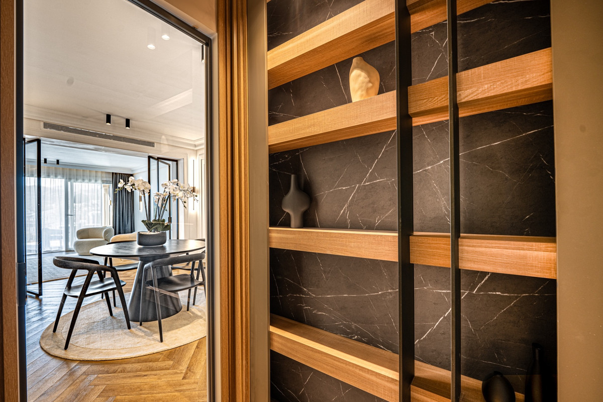 The townhouse features a warm and modern open-plan living and dining area with wooden accents. A large terrace flows from the living room, and all bedrooms have private terraces. The fully fitted kitchen is designed for both style and practicality. Interiors are bright and contemporary, blending comfort with a timeless design.