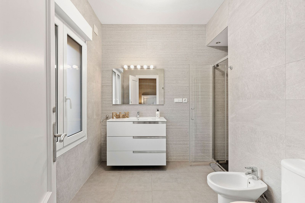 As you enter the villa you have a spacious living room leading in to the kitchen and diningroom. On this level you will also find the master bedroom en suite plus another bedroom with an ensuite bathroom. There is also a guest toilet on this level.
