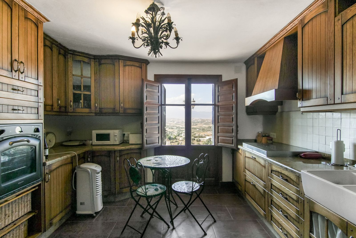 At the main entrance you will find two large bedrooms, with built-in wardrobes. There is a separate shower-room next to the bedrooms. On the way to the very spacious and open living room, you have a beautiful and rustic style independent kitchen. From the kitchen you can enter to the terrace, with amazing open views.