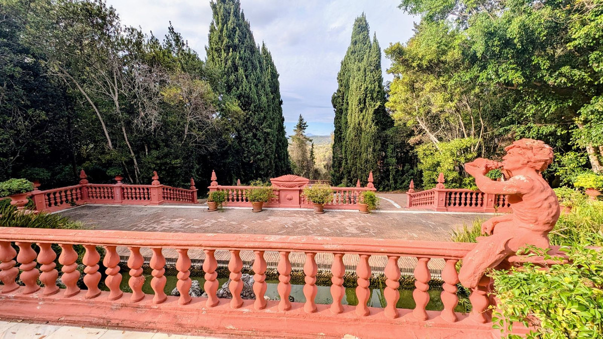 Extensive outdoor terraces with water features are connected by lush surrounding gardens and forests