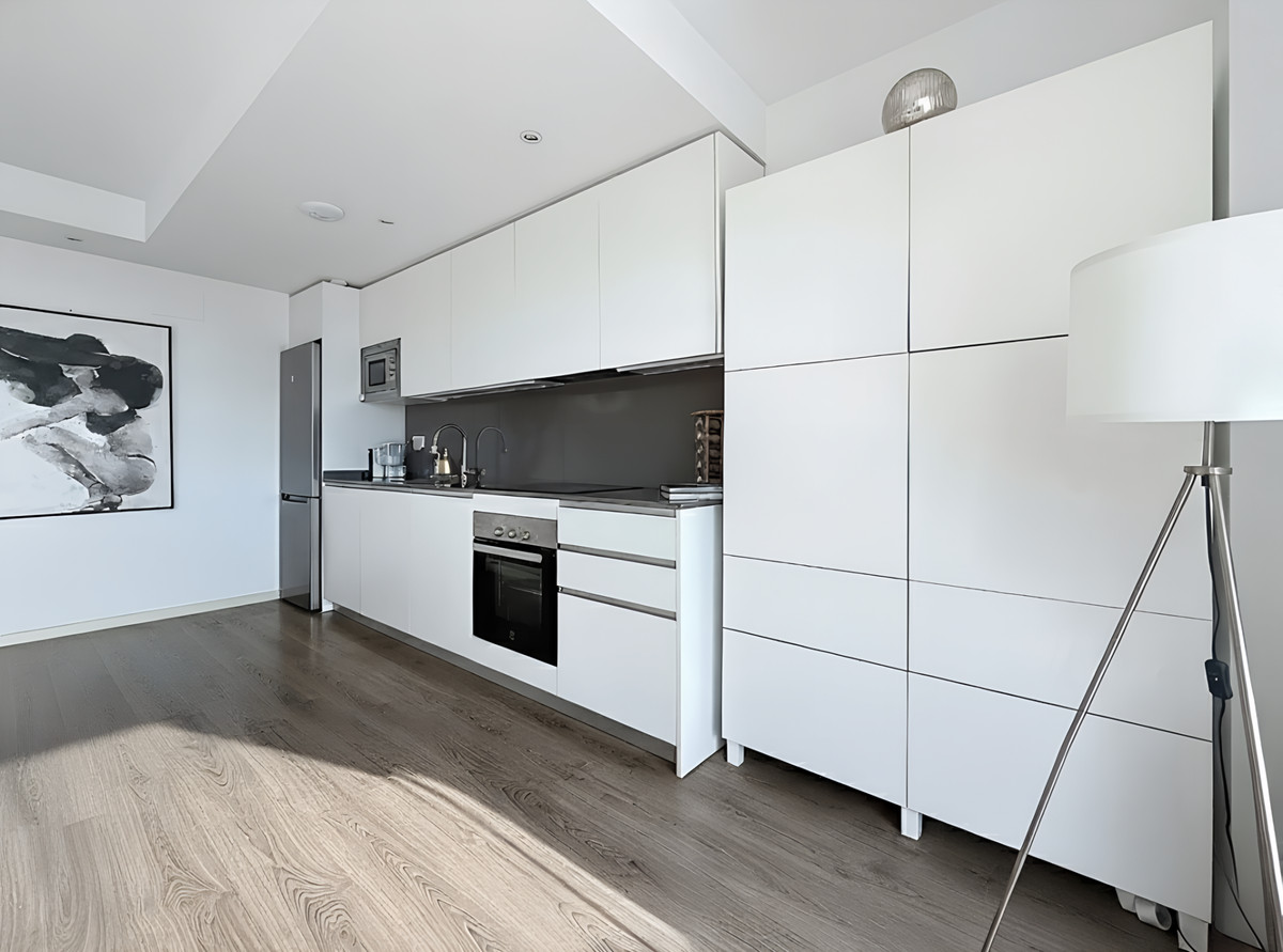 The home features a spacious main living room, designed with an open-concept layout, which integrates perfectly with the private terrace, allowing you to enjoy natural light and direct panoramic sea views. The kitchen, fully equipped and modern in style, is connected to the living room and includes high-quality appliances, as well as a practical laundry area.