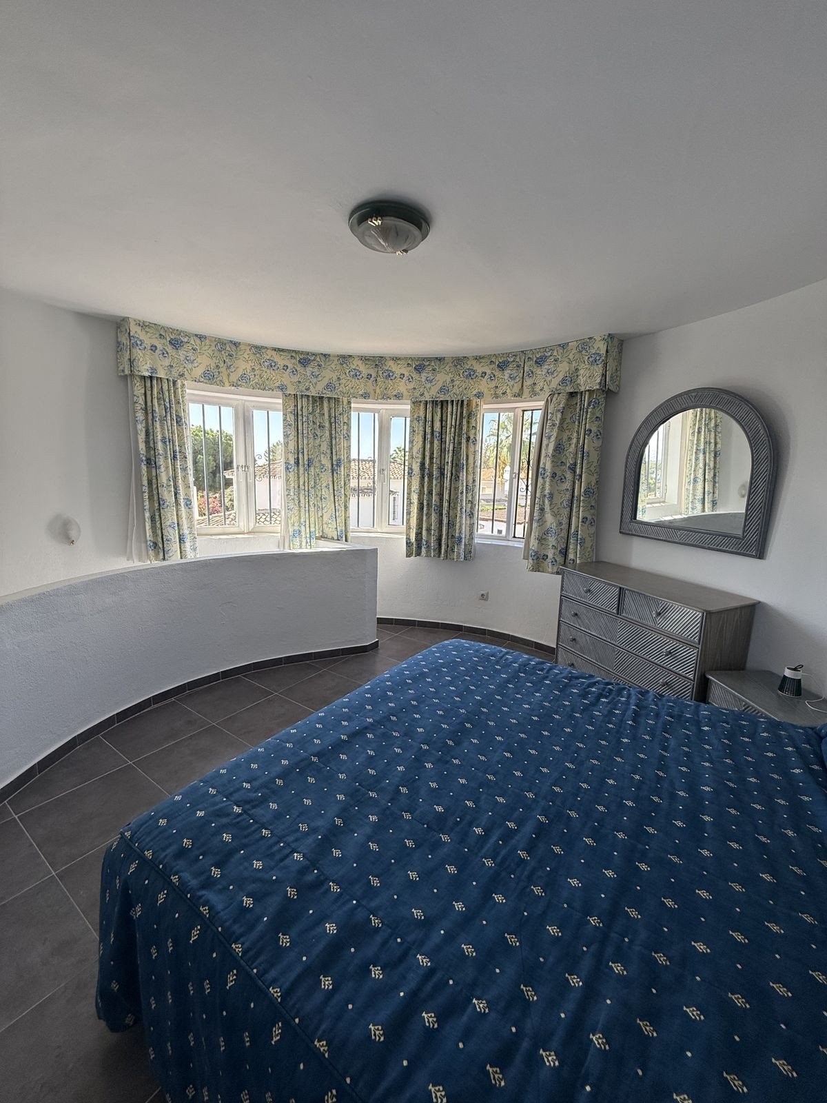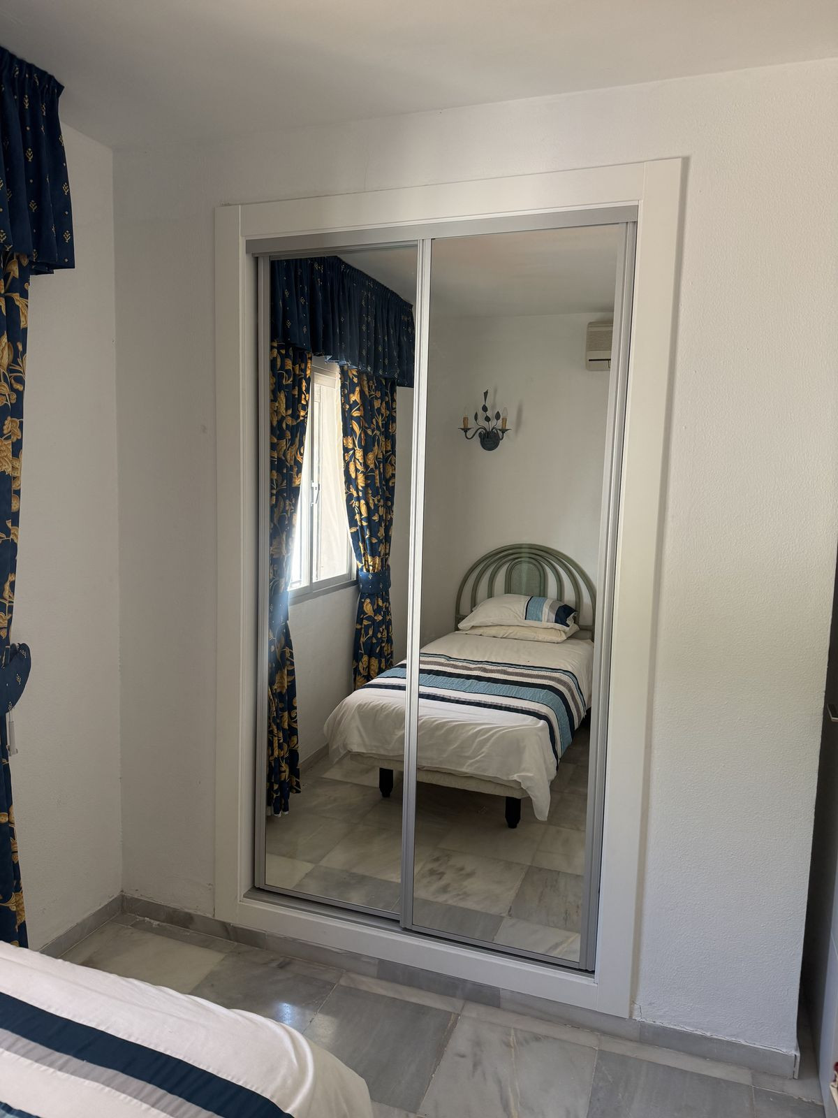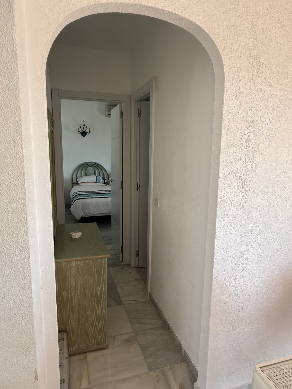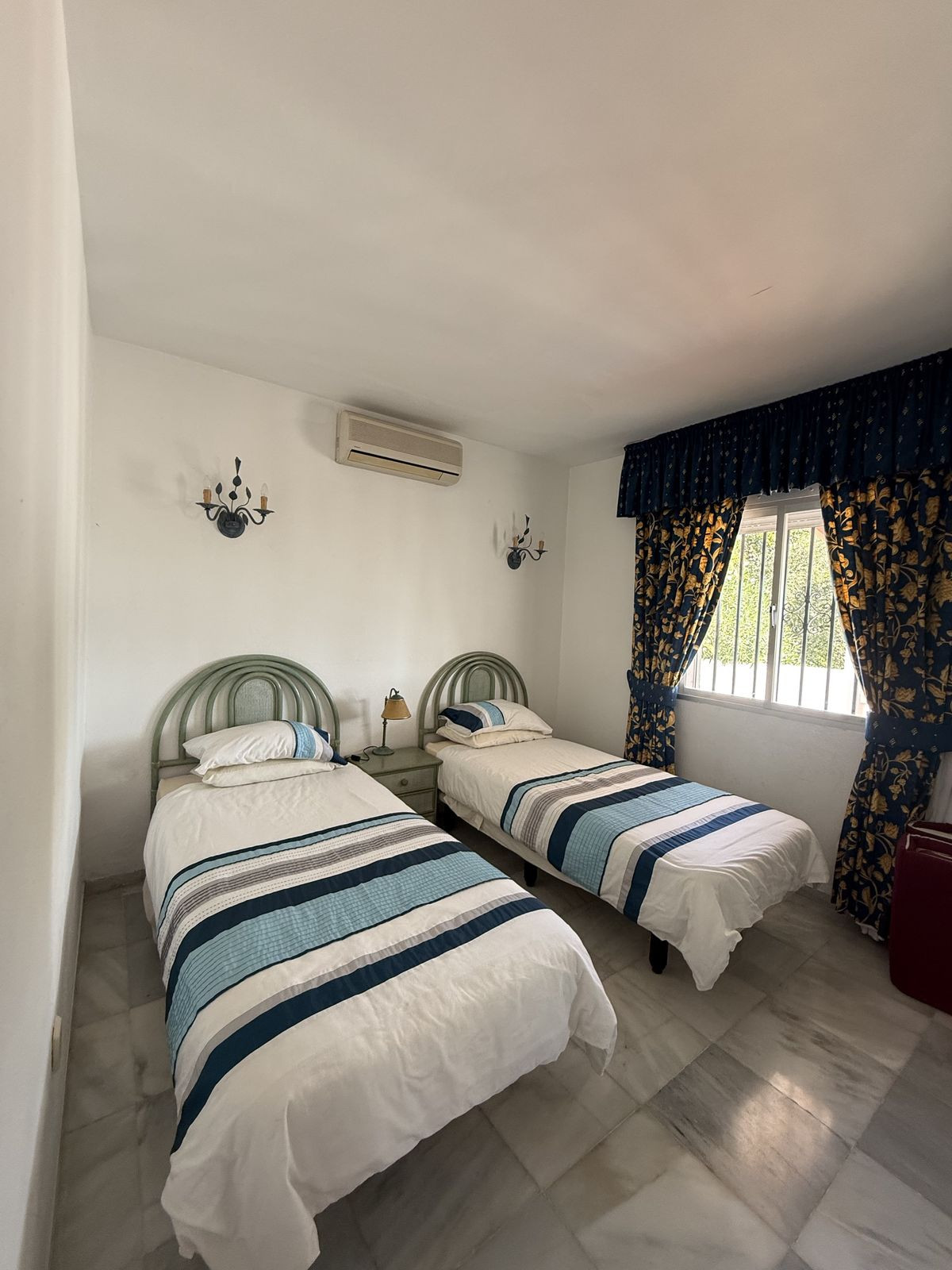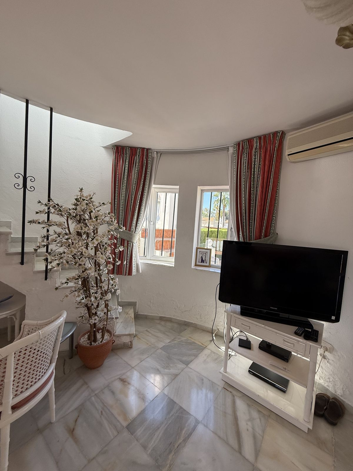 On the ground floor you have an open plan kitchen , living & dining space which leads out onto a very private covered terrace area, ideally for those summer nights. From the dining area you have access down the hallway to the guest bedroom and bathroom complete with bath. The guest bedroom is a very good size double ( currently set up with two single beds ) the bedroom also has built in wardrobes and AC.