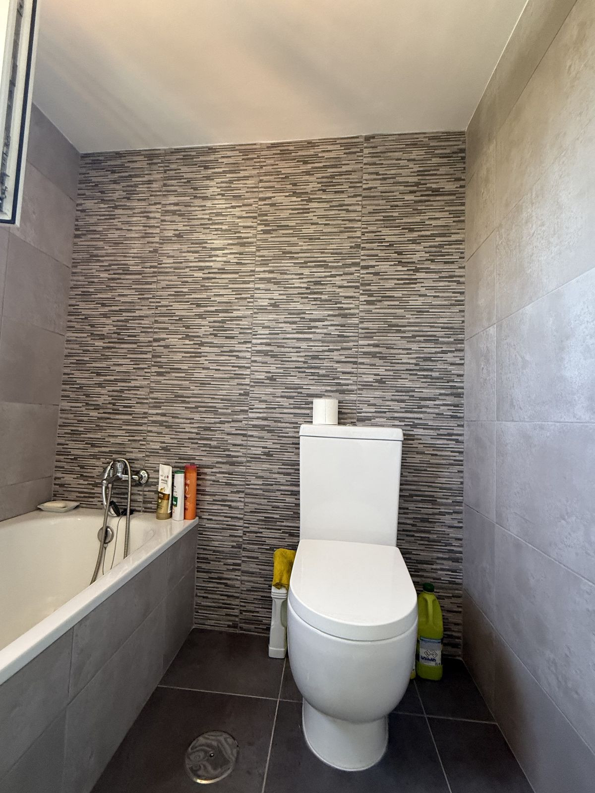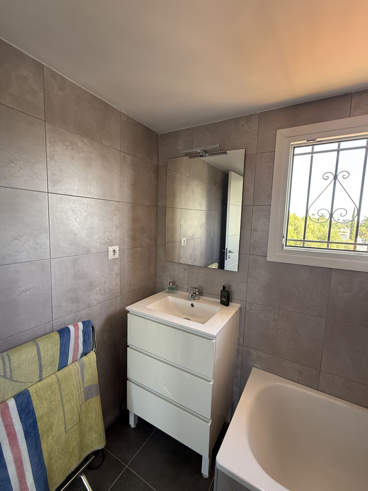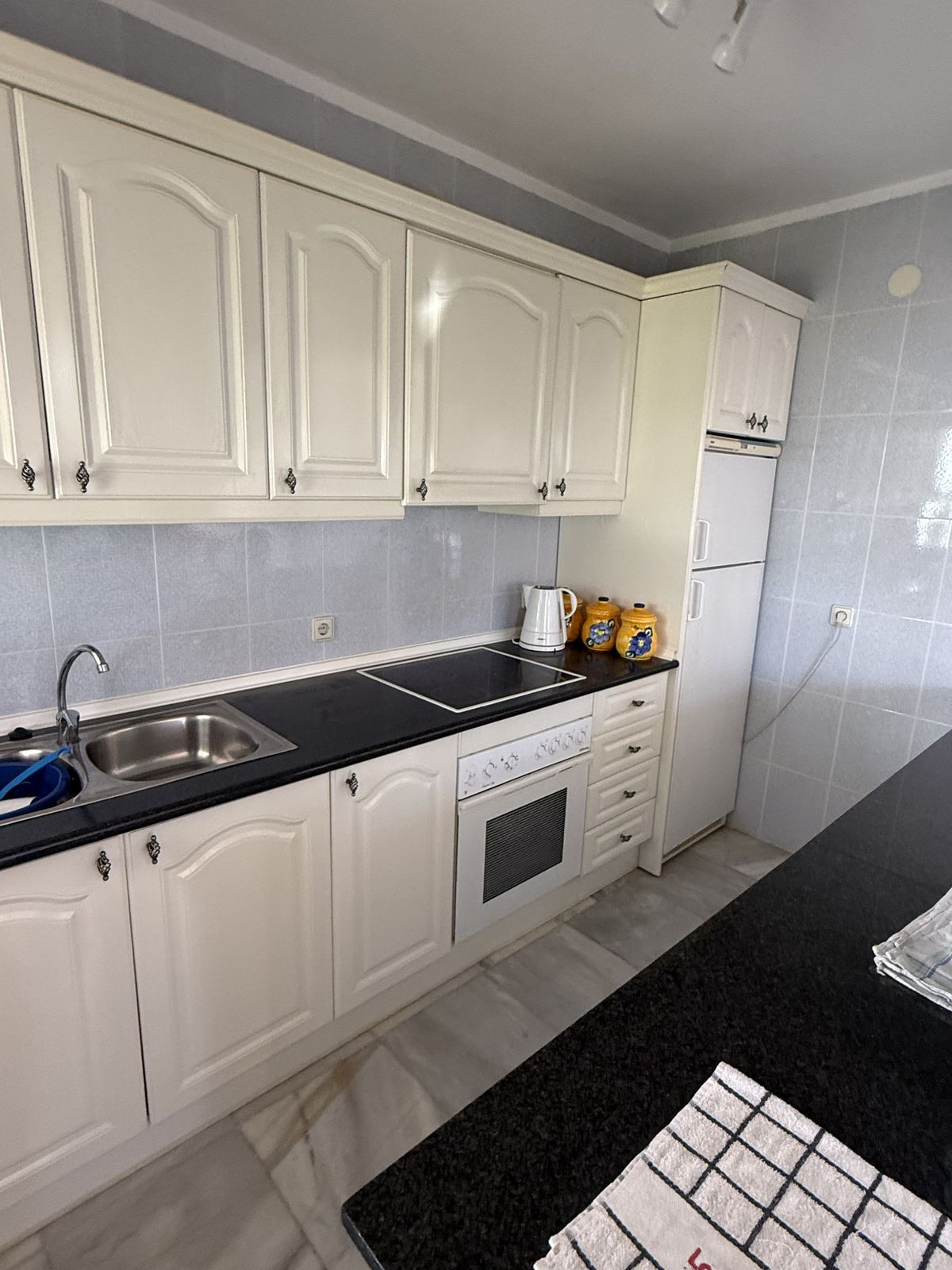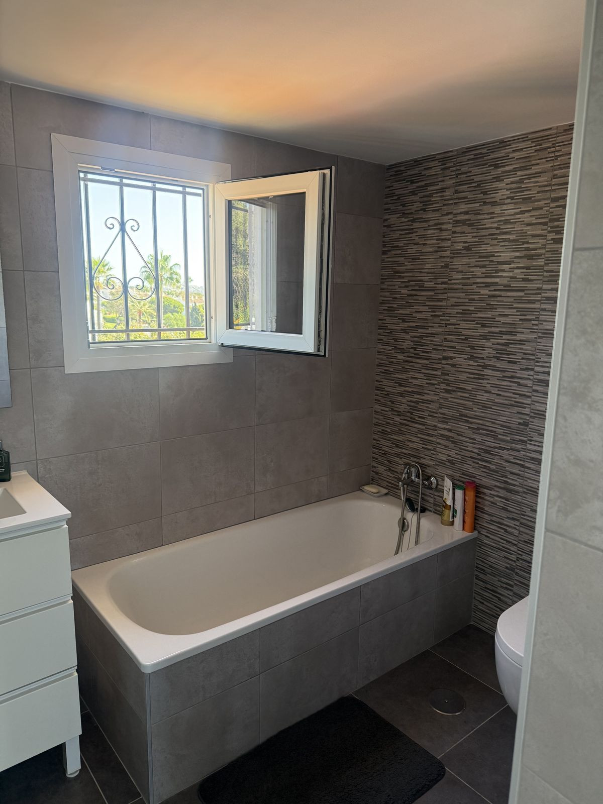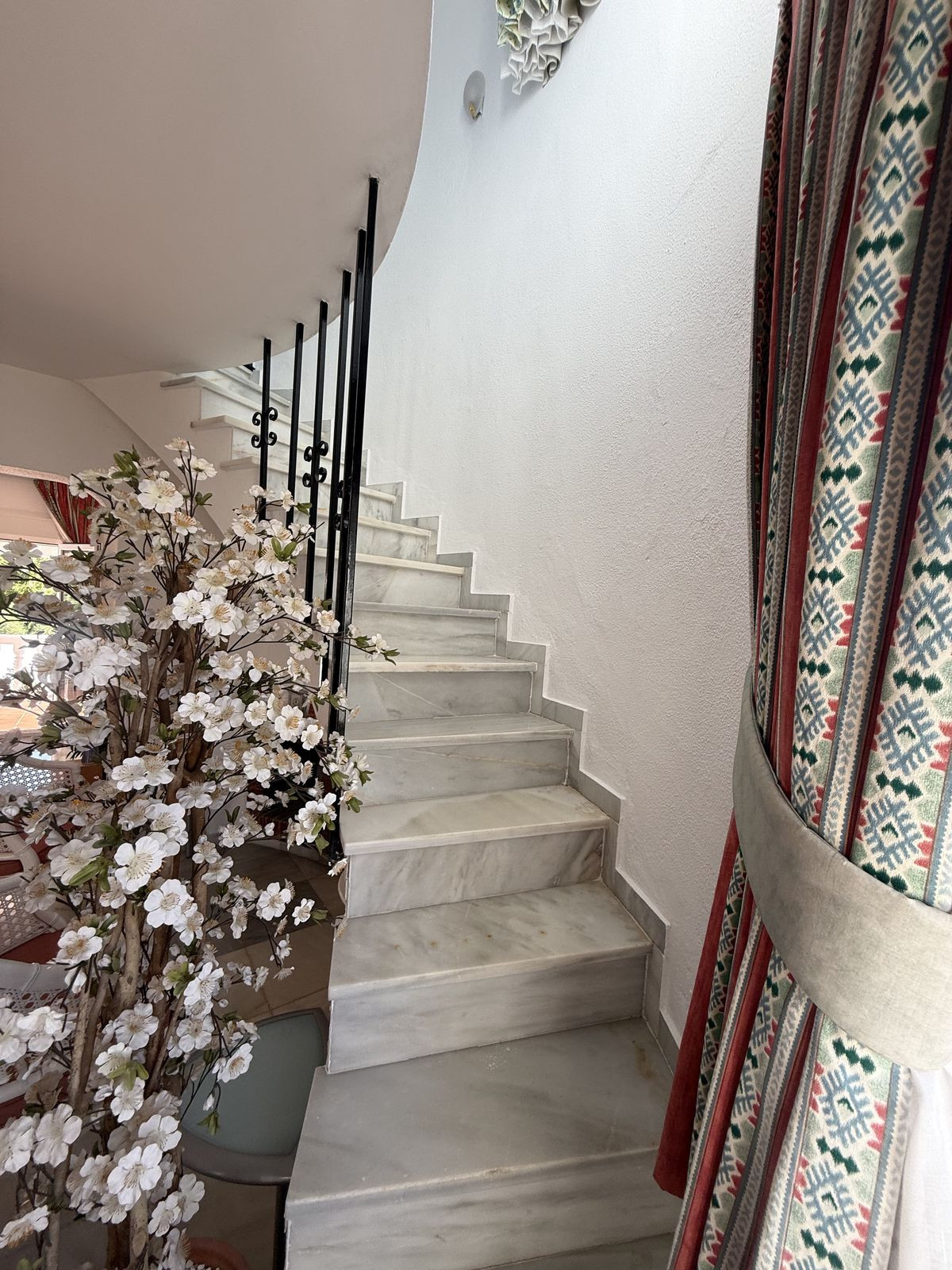 On the ground floor you have an open plan kitchen , living & dining space which leads out onto a very private covered terrace area, ideally for those summer nights. From the dining area you have access down the hallway to the guest bedroom and bathroom complete with bath. The guest bedroom is a very good size double ( currently set up with two single beds ) the bedroom also has built in wardrobes and AC.