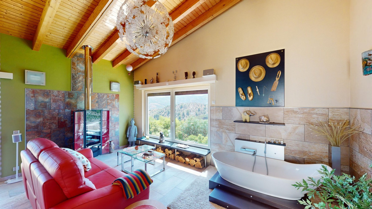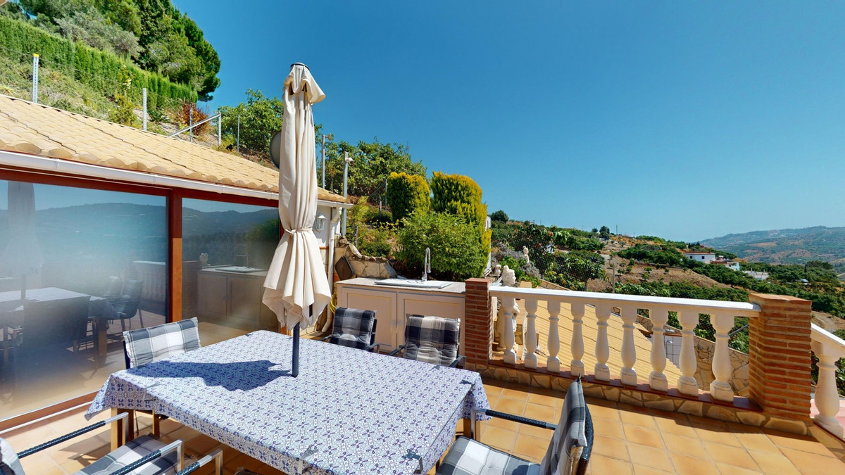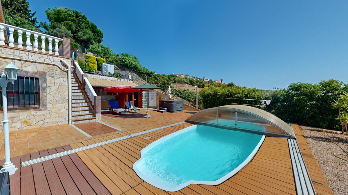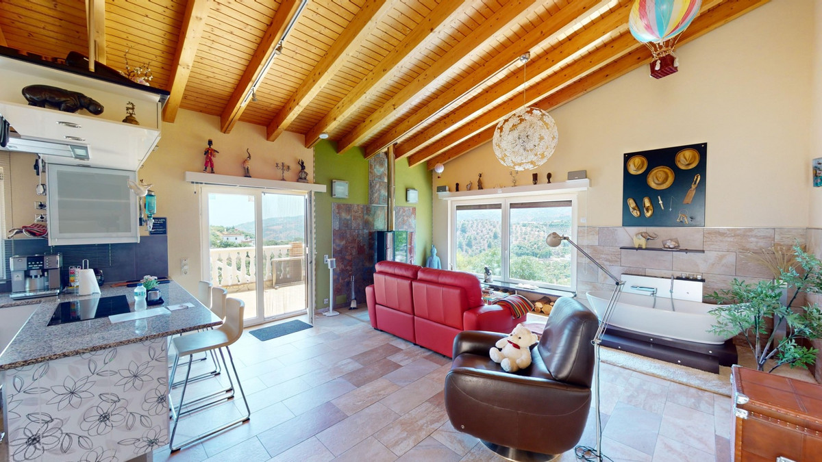 Stunning Villa Below Frigiliana for Sale. This impressive villa, nestled below Frigiliana, offers two separate living units across two floors, each with its own driveway and privacy. The upper unit spans 150 m2 and features a spacious open-plan living and dining area with an adjoining kitchen and convenient storage space. From the terrace, enjoy breathtaking views of the surrounding mountains. A standout feature of this apartment is the rotating fireplace in the living room, adding warmth and ambiance. Additionally, the terrace accommodates a fitness room. Another highlight is the luxurious bathtub in the living room, perfect for relaxing moments. The unit comprises three spacious bedrooms, two bathrooms (one en-suite in the master bedroom), and a guest toilet. The lower unit includes a cozy living and dining area with a kitchen, one bedroom, and a bathroom, totaling 80 m2 of living space. The entire house is equipped with underfloor heating, air conditioning, and a central vacuum system, built to the highest German standards with excellent insulation and quality materials. A solar panel system on the roof provides heating and hot water. The outdoor area of this exceptional villa leaves nothing to be desired. There is a heated saltwater pool with an easy-to-operate cover, a relaxing jacuzzi, and a fully equipped outdoor kitchen with a sauna. Additionally, there is a workshop, a caravan, and another small building at the foot of the property. The 6000 m2 plot is adorned with numerous fruit trees, inviting nature lovers to linger. The villa boasts good connectivity and is perfect for those who appreciate a tranquil lifestyle amidst nature. Experience luxurious living in a breathtaking location your new home below Frigiliana awaits! We are pleased to be able to present this dream property to you soon, either personally or via virtual viewing. Because this world is unique - just like our Axarquía. In Andalusia. On the Costa del Sol. Here, on the sunny side of life...
