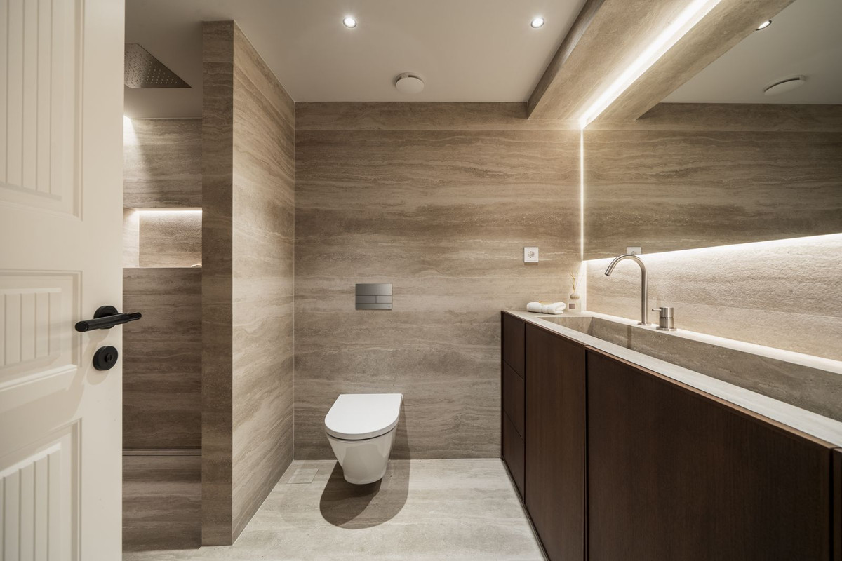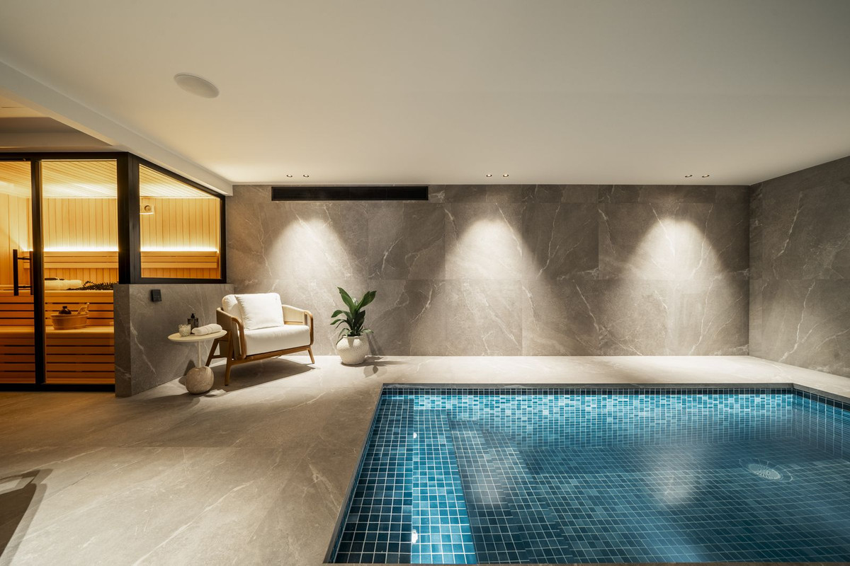 The villa offers five spacious bedrooms, thoughtfully distributed to ensure comfort for family and guests. The wellness area features an indoor pool, sauna, and steam room, creating a private spa experience within the home.