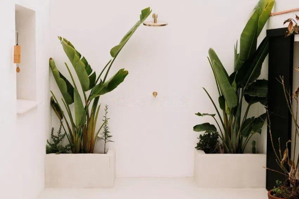 Entrance patio with microcement finish, sunny living area all day long, planters, and outdoor shower with hot and cold water.