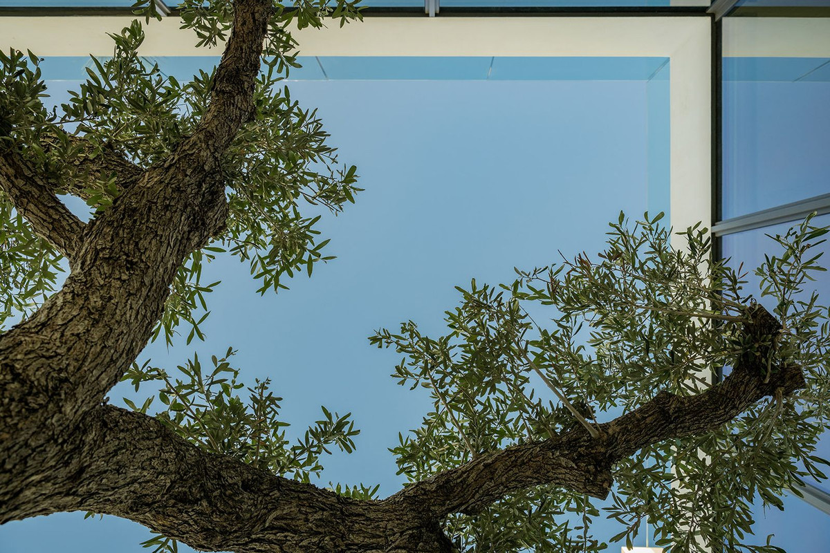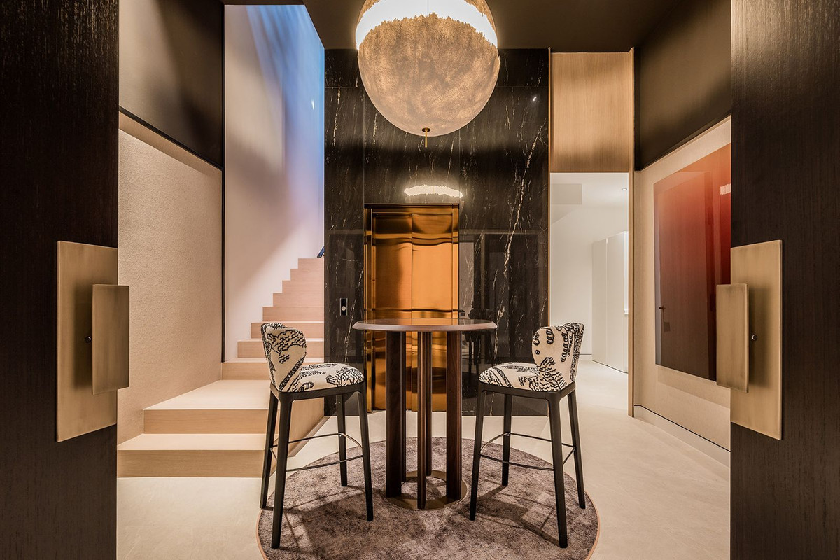 This villa spans four meticulously designed floors, connected by a private elevator. The spacious living area features a dramatic double-height ceiling, creating an airy, open atmosphere ideal for entertaining. This flows seamlessly onto a beautifully crafted terrace, perfect for embracing the indoor/outdoor lifestyle. The interior patio, complete with a mature olive tree, further enhances the villa’s expansive feel, blending nature and design. The state-of-the-art Gaggenau kitchen is a chef’s dream, equipped with top-of-the-line appliances, combining style with practicality.