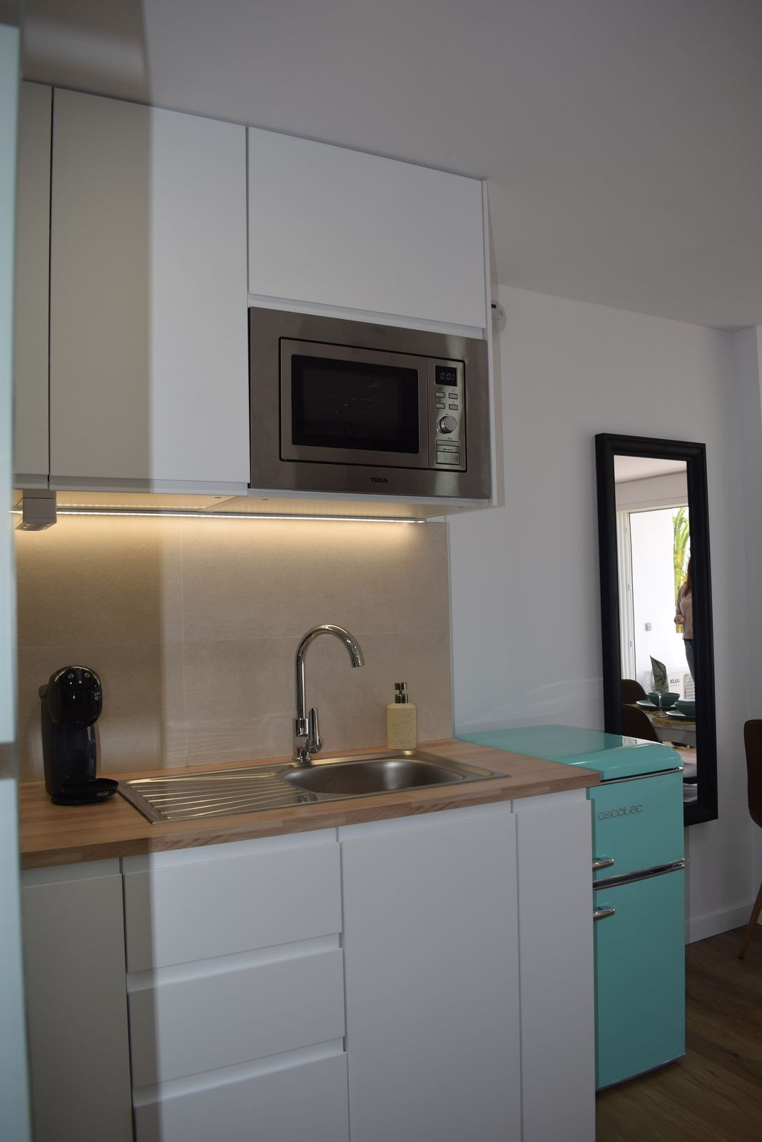 Ce bien a été entièrement rénové avec des finitions impeccables : électricité et plomberie neuves. Ses 53 m² construits (dont 40 m² habitables) se répartissent en un espace fonctionnel comprenant une cuisine moderne entièrement équipée (avec lave-linge et lave-vaisselle) et une salle de bains aux finitions contemporaines. L’espace de vie/chambre s’ouvre sur une terrasse spectaculaire.