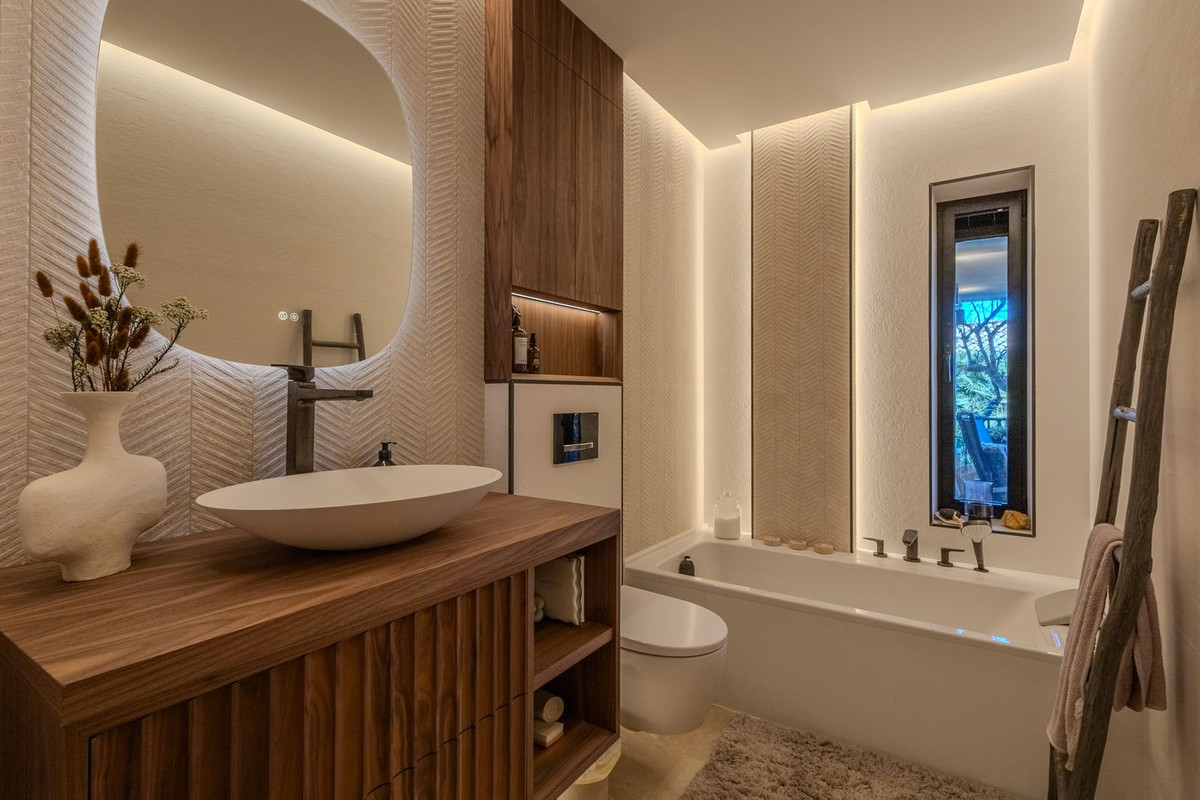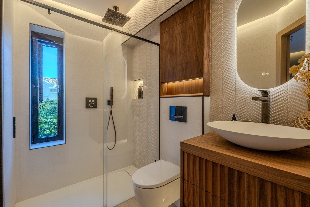 Résidence de prestige avec vue imprenable à La Cerquilla, Nueva Andalucía. Située dans le quartier résidentiel sécurisé et prestigieux d'Aldea Dorada, cette maison jumelée offre le confort d'une maison de ville et l'élégance d'un penthouse, dans l'un des emplacements les plus exclusifs et paisibles de Nueva Andalucía. De par sa position privilégiée, la propriété bénéficie d'une vue panoramique exceptionnelle sur la mer Méditerranée, la Vallée du Golfe et l'emblématique montagne de La Concha – un panorama considéré comme l'un des plus beaux de Nueva Andalucía et qui constitue l'atout majeur de la maison. Derrière une façade andalouse classique, l'intérieur révèle une rénovation chaleureuse et raffinée de style Japandi, avec de hauts plafonds, des espaces de vie ouverts et des salles de bains modernes qui créent une atmosphère calme et élégante. Le rez-de-chaussée offre un espace de vie et salle à manger ouvert avec une cheminée suspendue du plus bel effet, un espace bureau discret et un accès direct à une terrasse partiellement couverte conçue pour profiter pleinement de la vue. Cette maison offre 300 m² habitables, 76 m² de terrasses et un jardin privatif de 300 m² planté d'avocatiers, de manguiers et de grenadilles. Une piscine privée sur la terrasse supérieure offre un véritable havre de paix en plein air. La propriété comprend quatre chambres et trois salles de bains, avec un fort potentiel pour créer une suite parentale luxueuse avec dressing et salle de bains attenante. Elle dispose également d'une salle de sport privée, de deux grands débarras, d'un parking couvert pour deux voitures et de terrasses au rez-de-chaussée avec accès direct au jardin. Une opportunité rare pour les acquéreurs à la recherche d'une maison mitoyenne de luxe, sécurisée, offrant une vue imprenable et un entretien facile.