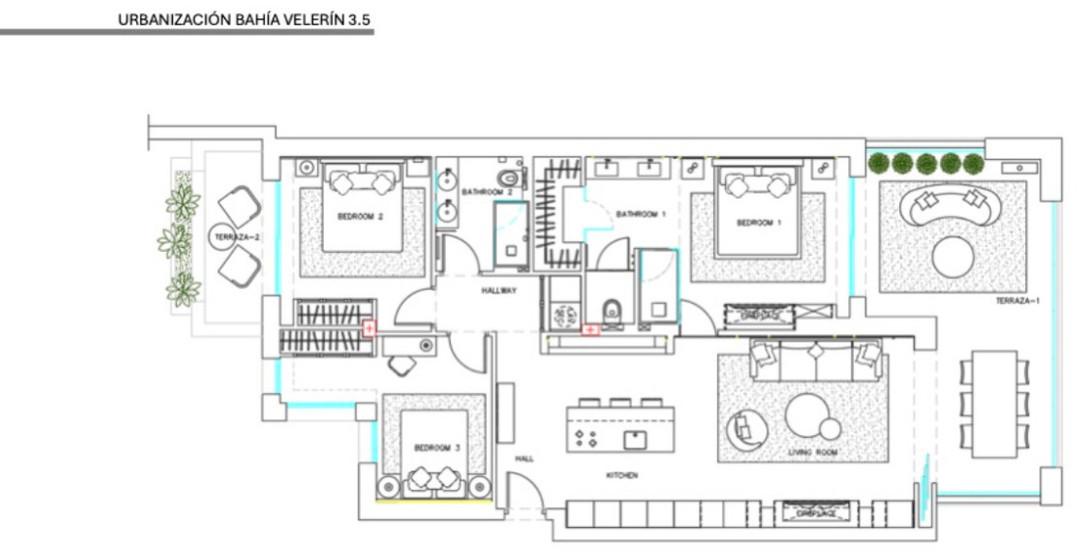 Bahía del Velerín 3.5 est un appartement de luxe clé en main, idéalement situé en bord de mer. Rénové avec des prestations haut de gamme, il est disponible immédiatement pour une occupation ou un investissement locatif. Avec ses 3 chambres, 2 salles de bains, ses 120 m² d'espace intérieur élégant et sa terrasse de 38 m² donnant sur un jardin luxuriant et la mer Méditerranée, ce bien représente une opportunité exceptionnelle.