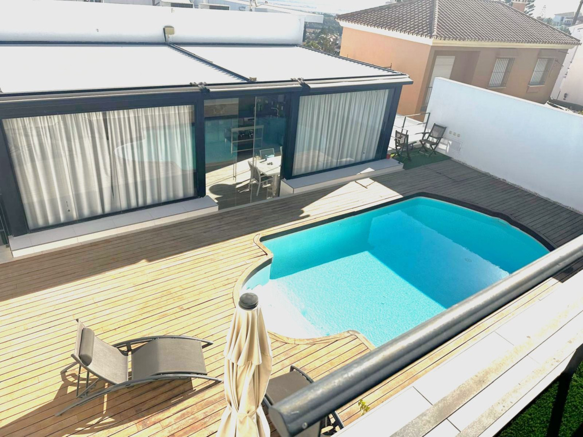 • À l'étage supérieur se trouvent deux chambres, une salle de bains, une terrasse couverte et découverte, et la piscine privée de 21 m².