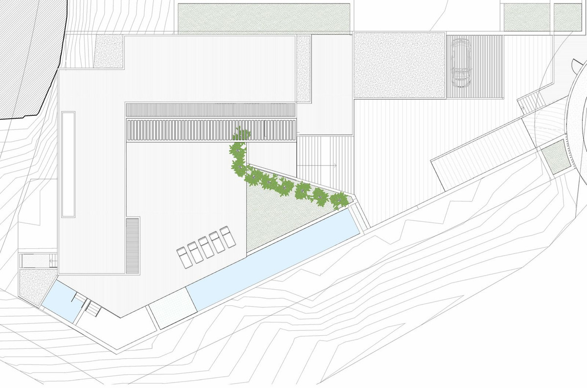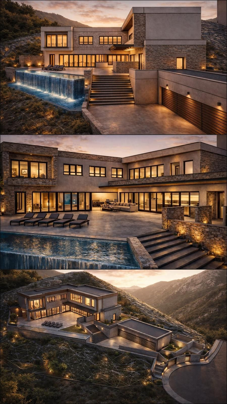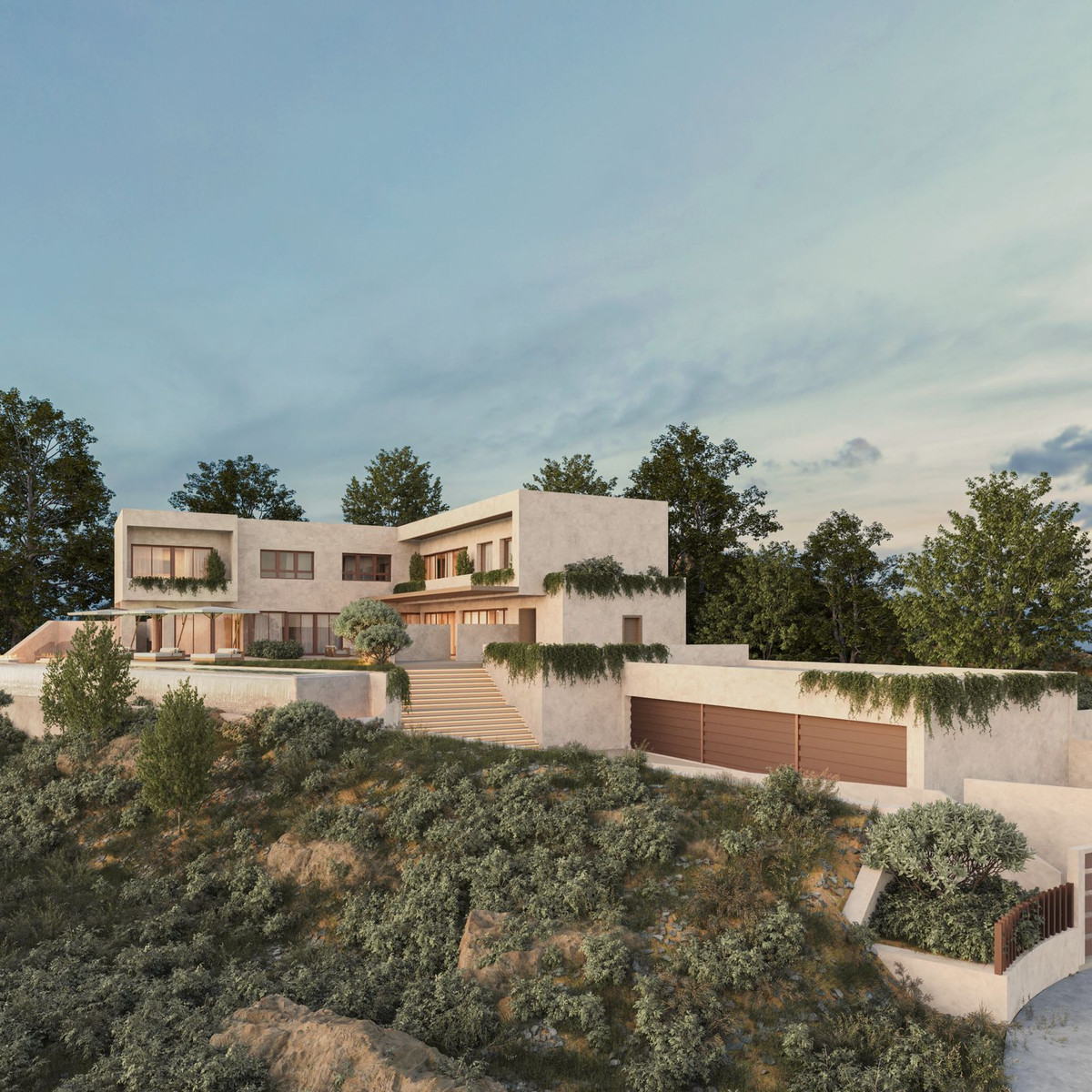 Landscaped terraces where the sun spills over at sunset.