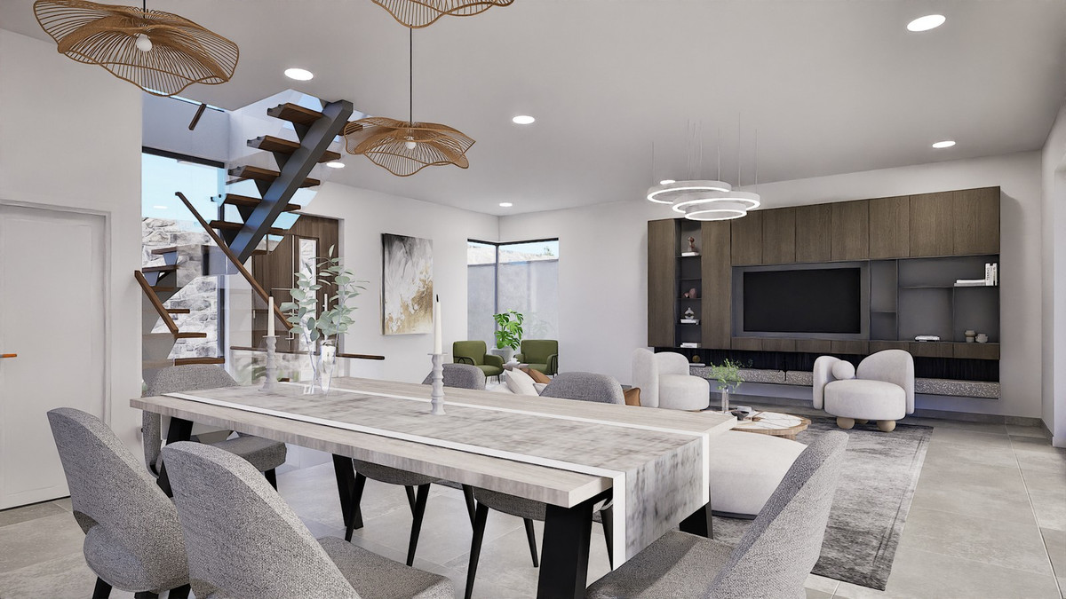 Ground Floor: True open concept. Living room and kitchen flow directly onto the terrace and infinity pool. Views of nature and the sea, bringing the outside in.