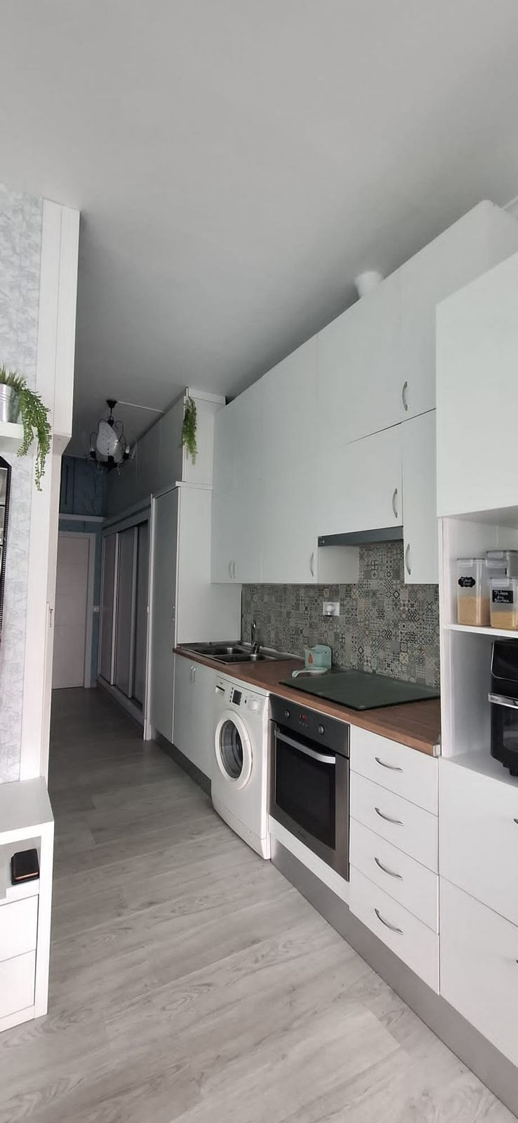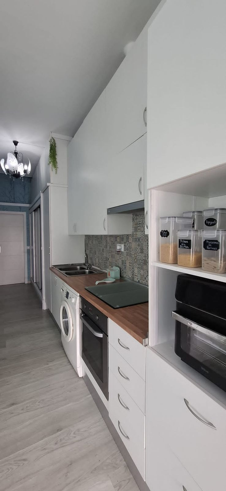 Cuisine entièrement équipée avec appareils intégrés et design pratique.