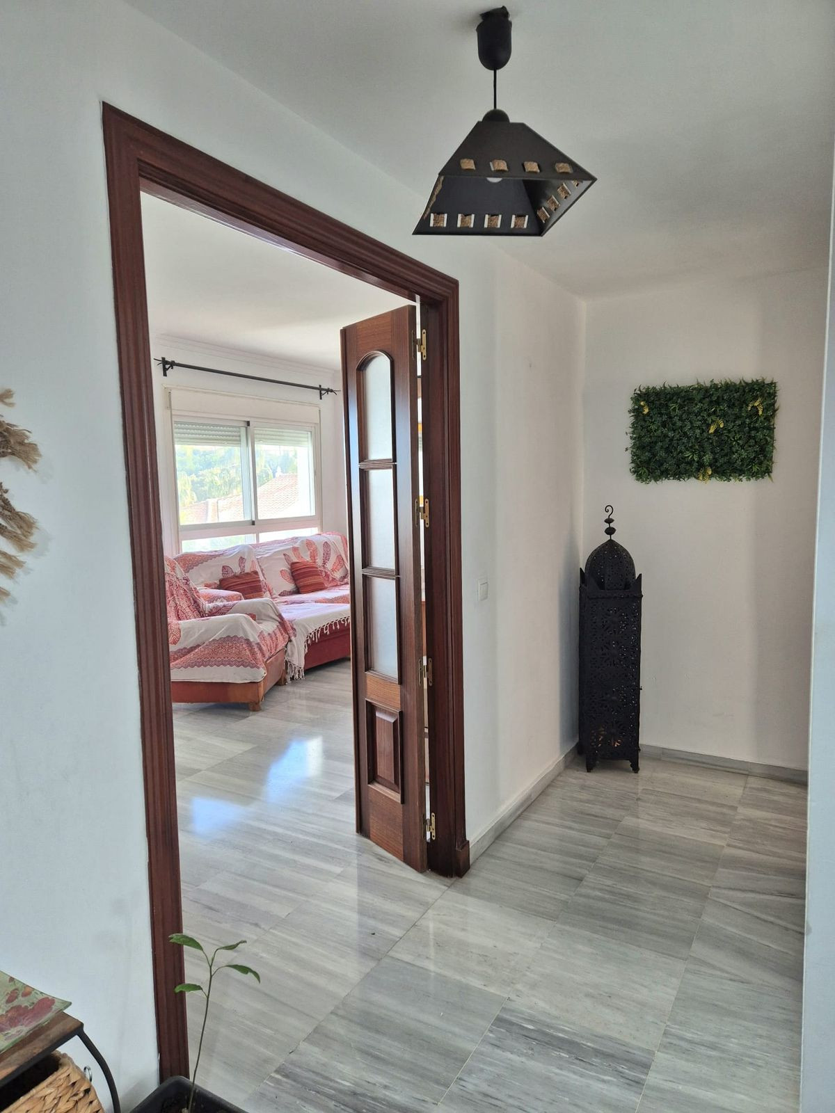 The property in on the middle floor of an elevated block located in Alhaurín Golf, you can access the portal via stairs or lift. You enter the apartment into a hallway, to the right you have a fully fitted kitchen and to the left you have the master bedroom, with fitted wardrobes and en suite bathroom with bath / shower combi. You can access the wrap around terrace that has glass curtains. Back into the hallway you enter the living / dining room with a large window and access to the enclosed large terrace with glass curtains throughout where you can enjoy the morning sun and winter days as well as fully opening them up for the summer. Back into the hallway at the end there is a door that leads to the 2nd bathroom and 2 double bedrooms with fitted wardrobes. There is air co hot and cold in all the bedrooms and living room. The price includes a parking space and a storage room. The property comes unfurnished.