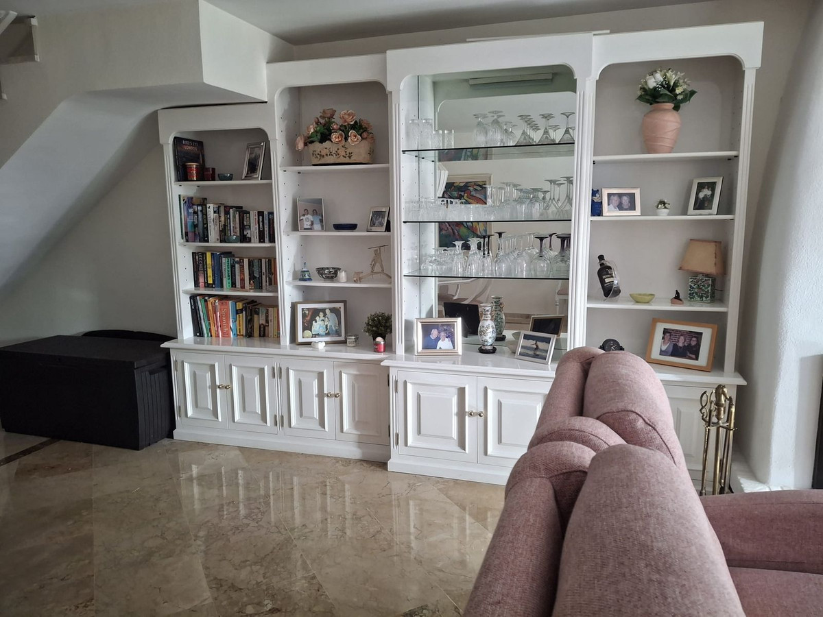 Townhouse located in a small Andalucian pueblo style community in Nueva Atalaya. The property is situated in a quiet cul de sac close to all local amenities, shopping centre, schools and golf. The community boasts a large swimming pool and park sized landscaped gardens. The south facing house is built on 2 levels with an entrance hall,with a comfortable lounge dining area and a modern kitchen on the ground floor.. On the second floor it has 2 bedrooms, 2 bathrooms, one on-suite and two terraces. The lounge and terraces face onto the large communal gardens with a sea view from the main bedroom .It is well presented with a modern kitchen, air conditioning and fireplace in the lounge. Private parking directly in front of the house.