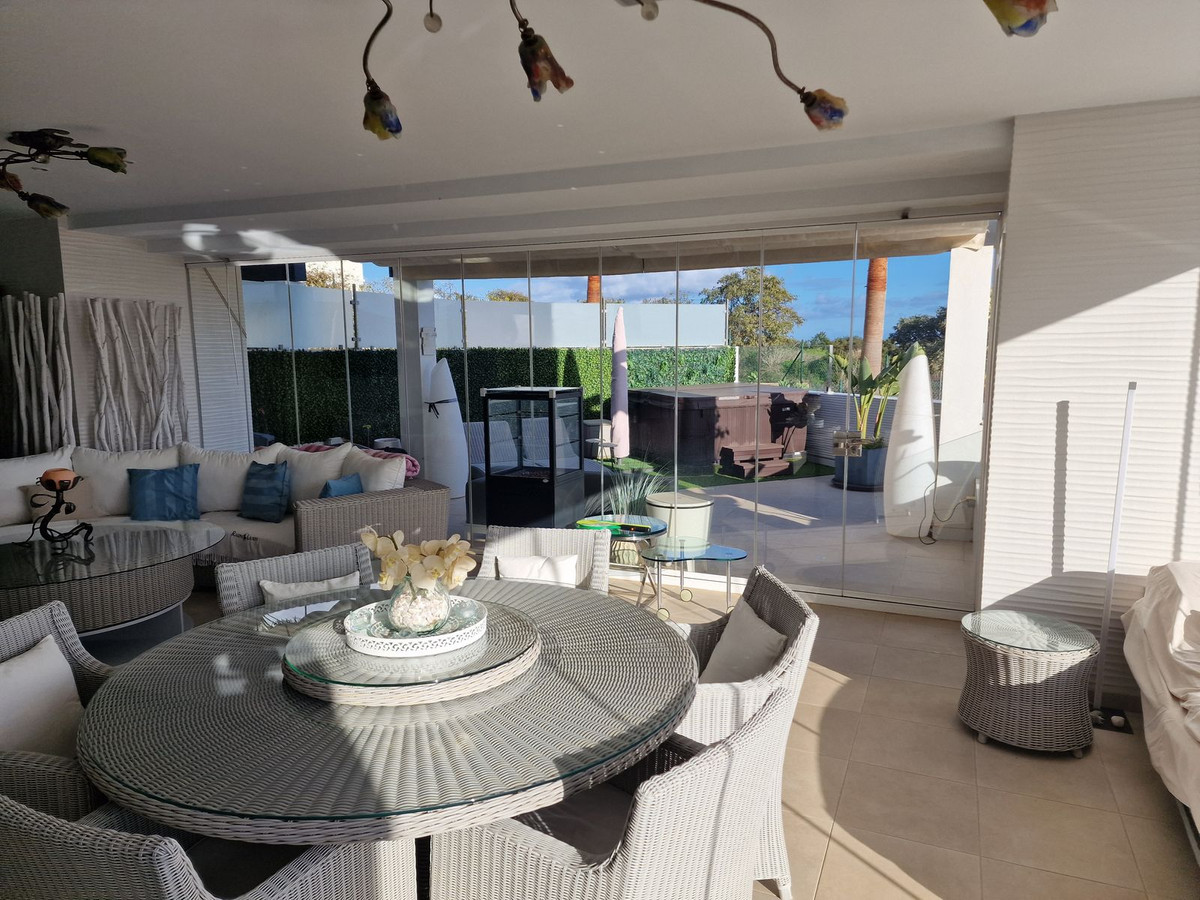 This beautiful 2 bedroom, ground floor apartment has the most amazing 122m terracing with wonderful panoramic views and is located within the gated, 5 star estate of Finca Cortesin. Newly finished in 2017 everything is ultra modern and pure perfection. From the open plan kitchen and underfloor heating in the bathrooms to the domotics system and stylish decor. This apartment has 2 large bedrooms, both with an ensuite bathroom. Both bedrooms lead on to terraces with the second bedroom boasting a private garden area as well. The main terrace is partially enclosed with glass curtains and has four separate seating areas, plus a Jacuzzi. There is a third terrace which runs the length of the apartment from which you can enjoy the stunning west facing views while watching the sun set over the surrounding hills..The panoramic views of the coast and Finca Cortesin golf are simply beautiful and the tranquility is second to none. This property is being sold fully furnished with 2 underground garage spaces and a storage room.