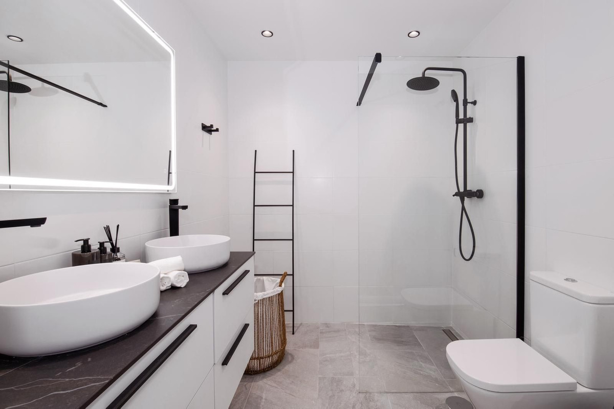 The property offers two beautifully appointed bedrooms, including a tranquil master suite with direct terrace access and an elegant en-suite bathroom. Both bathrooms are finished to an exceptional standard, featuring walk-in rainfall showers, contemporary fixtures, floating vanity units, and ambient LED lighting. A separate laundry/utility room adds further practicality to this refined home.