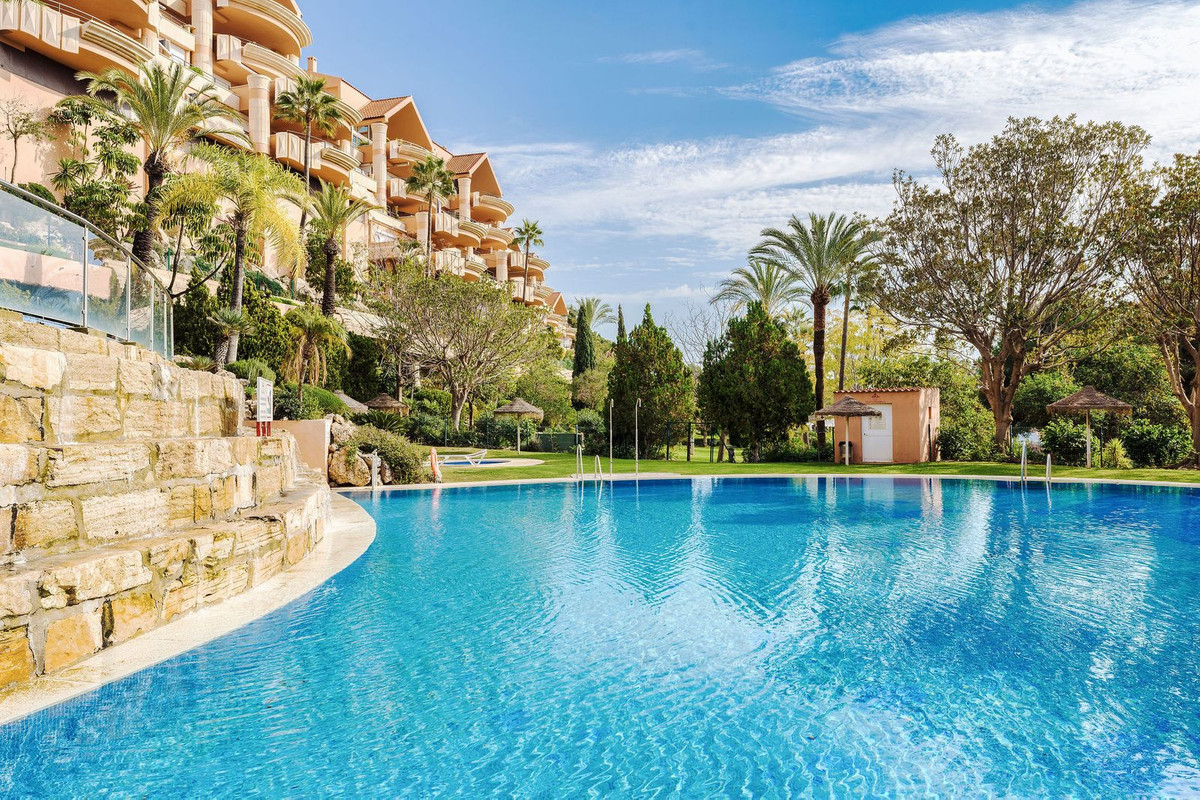 Introducing this spacious two-bedroom corner apartment located in the sought-after development of Magna Marbella in Nueva Andalucia offering stunning panoramic sea, mountain & golf views from it's west facing terrace. The accomodation comprises an entrance hall, fully equipped kitchen, spacious lounge & dining area leading directly out onto the covered/uncovered terrace, master bedroom suite with direct access to the terrace and a good-sized guest bedroom & family bathroom. This unit has the possibilty to be converted into a three-bedroom and an extra special feature is the large double terrace. The development itself is gated with 24-hour security, two communal pools and 1 underground parking space and storage room included in the price.
