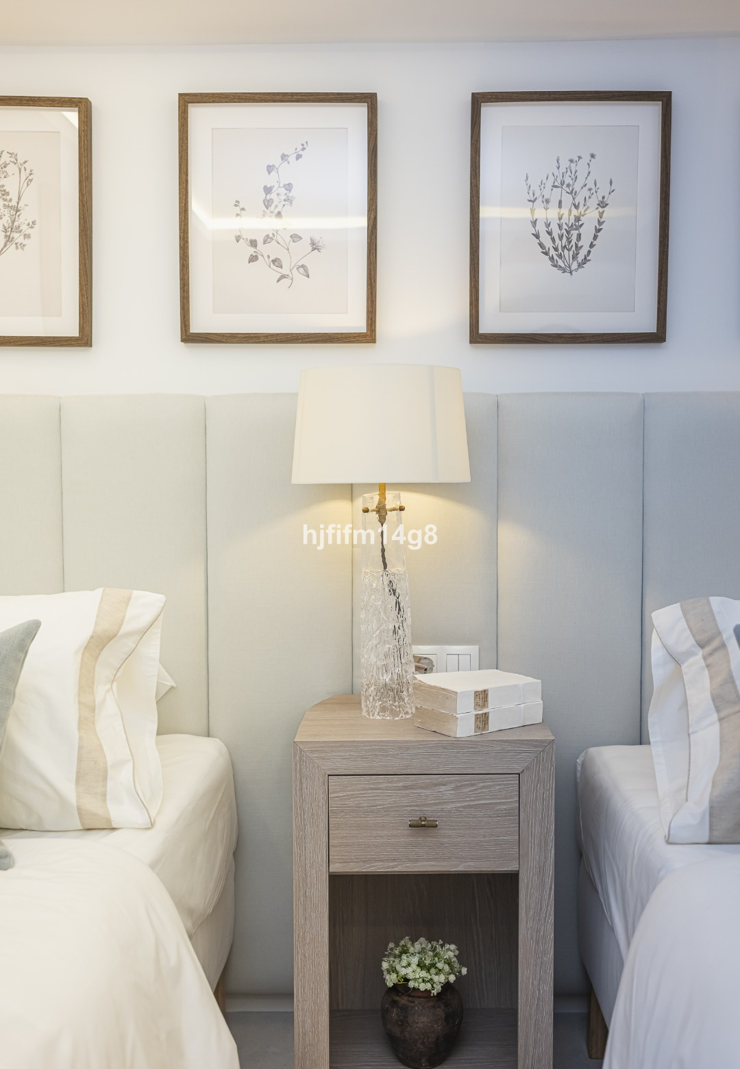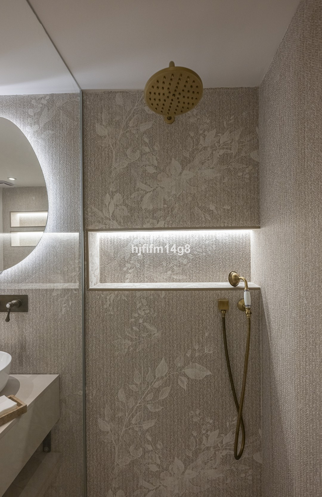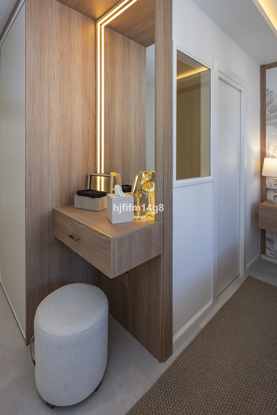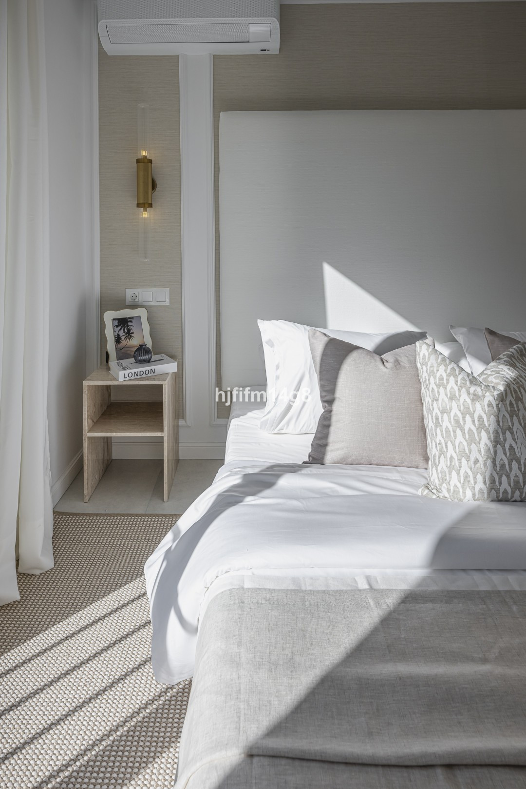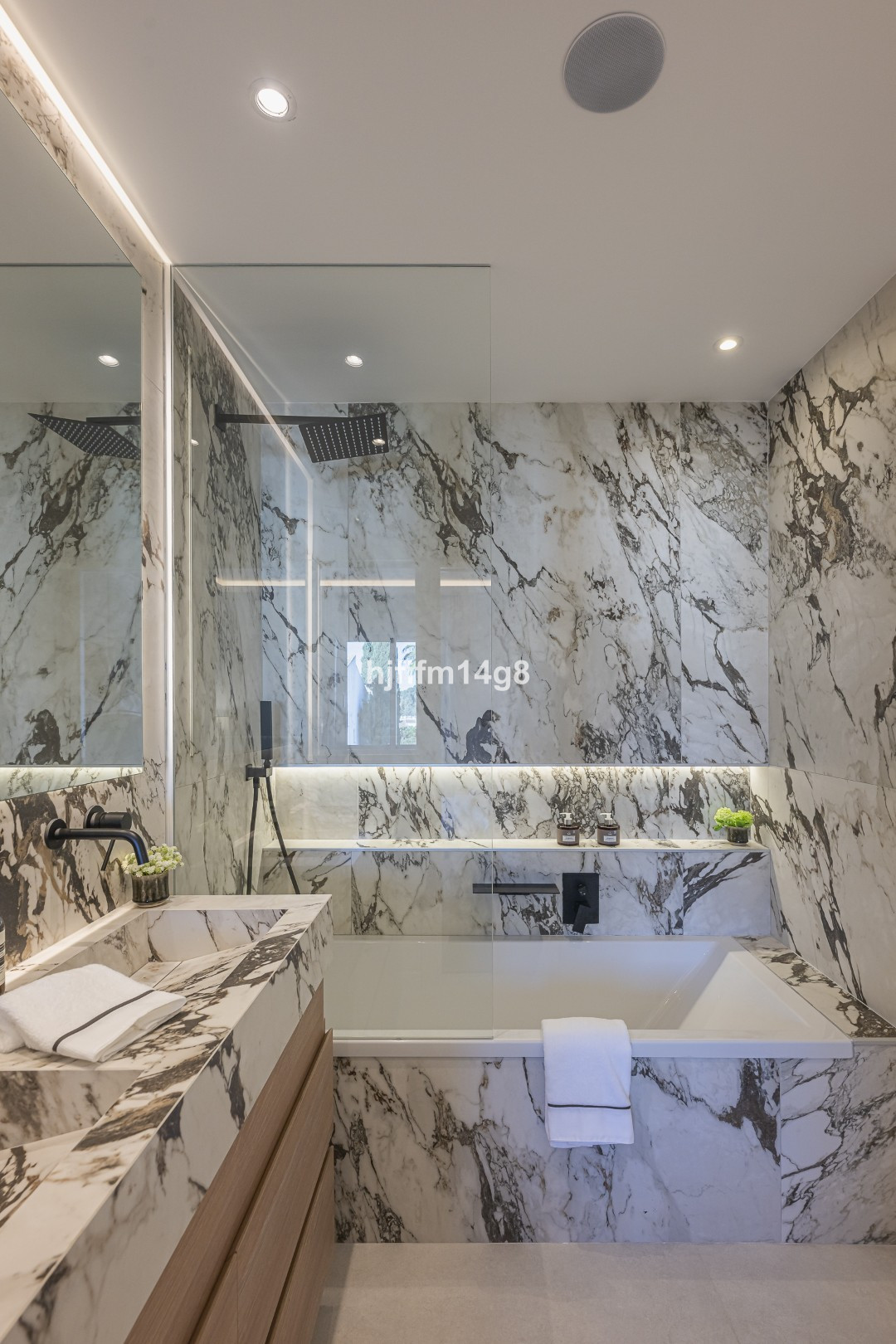 The upper floor hosts an elegant master bedroom with en-suite bathroom and a guest bedroom also with its own en-suite bathroom. These spaces feature custom-made wardrobes and bespoke bathroom vanities, with refined finishes including travertine bedside tables in the bedroom opposite the master suite. All bathrooms are fitted with XXL format tiles, while the guest toilet showcases beautiful high-end textured porcelain tiles.