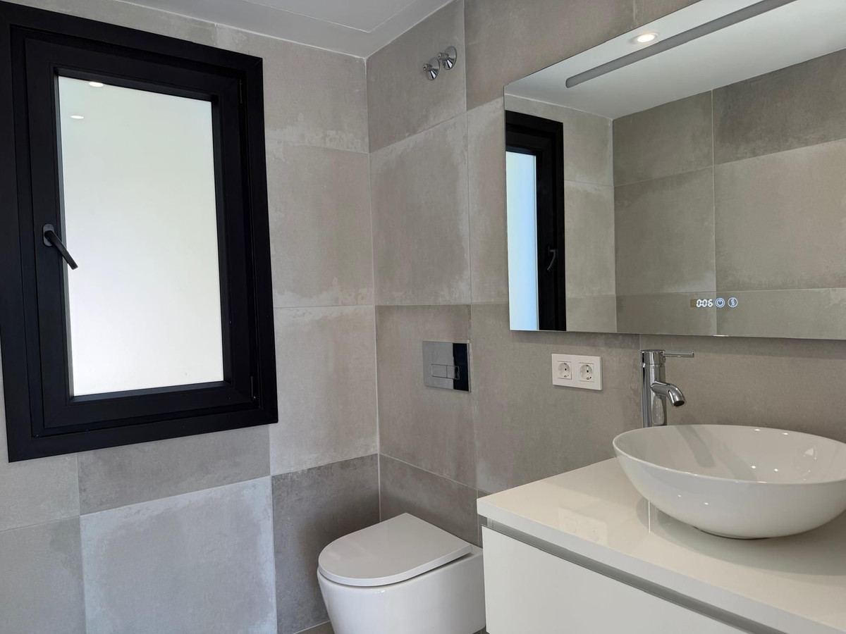 Filled with natural light, the villa boasts open-plan living areas with large windows and glass doors, seamlessly connecting indoor and outdoor spaces and enjoys open views with pleasant sea views. The modern open-plan kitchen features a large central island with an integrated cooking field, ideal for both everyday living and entertaining guests.