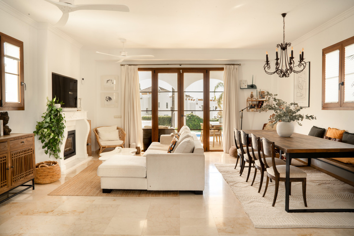 The villa offers 295 m² of bright interior space on a 515 m² private plot with a stylish open-plan living room, dining area and fully fitted modern kitchen, all flooded with natural light and opening directly onto a large sunny terrace with private swimming pool, landscaped garden and outdoor dining and lounge areas—ideal for entertaining and enjoying the Costa del Sol climate.