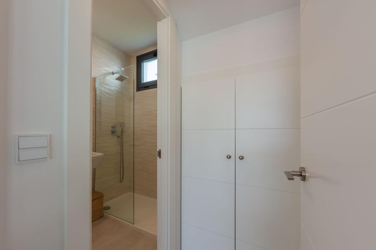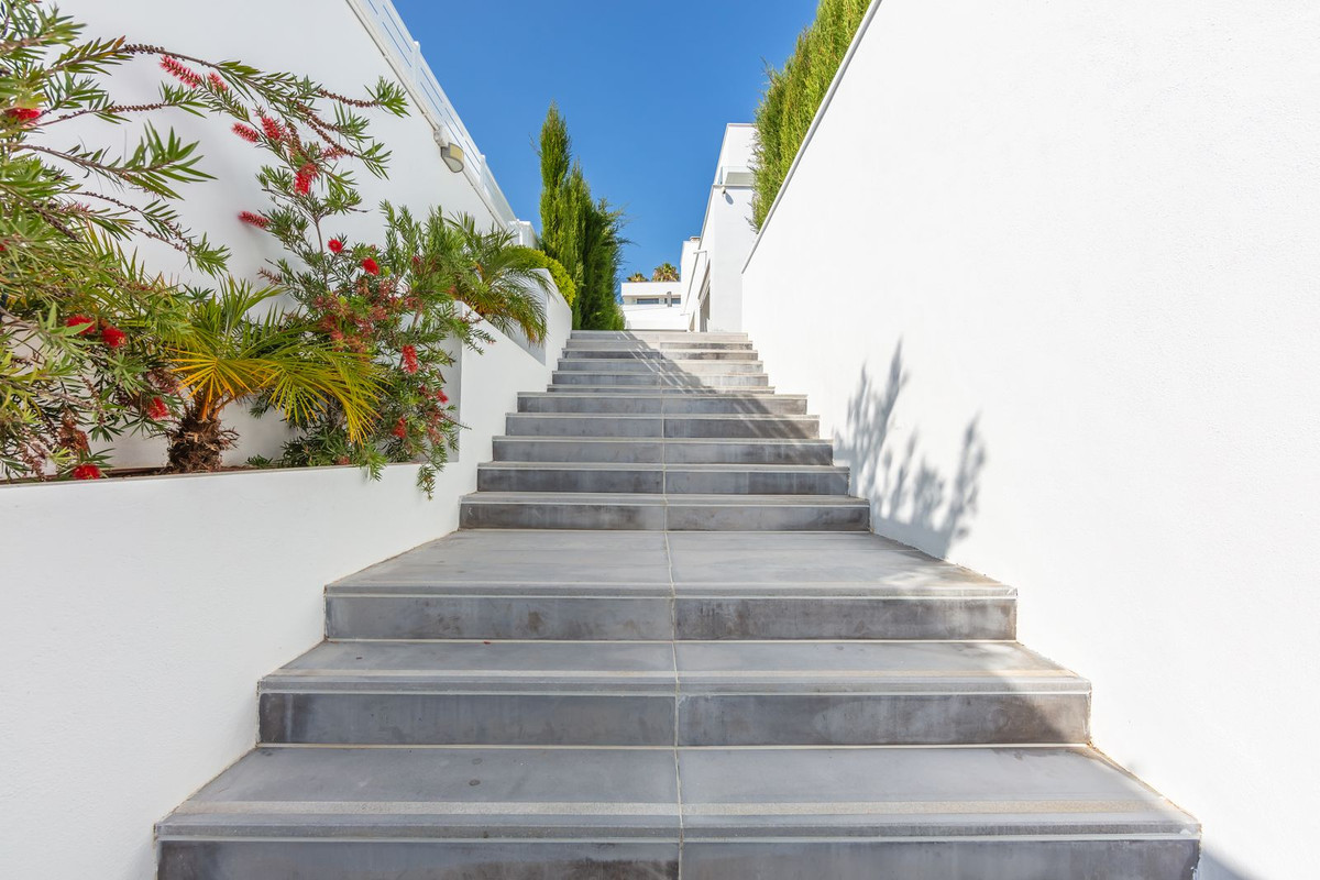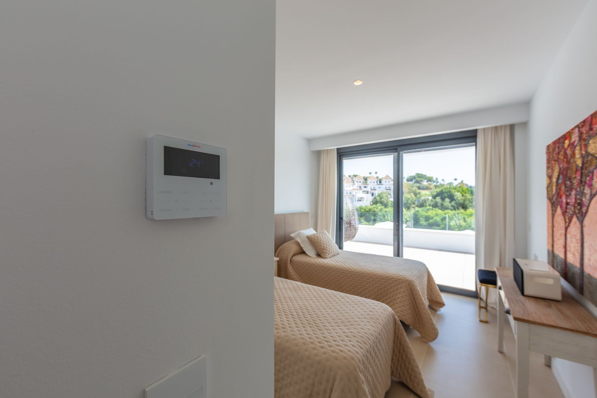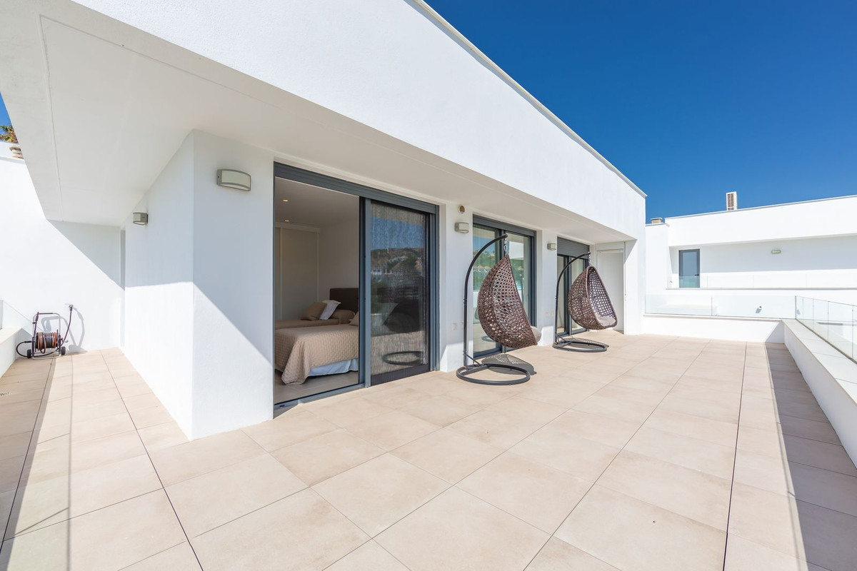 Magnificent contemporary-style villa, recently built using high-quality materials, offering beautiful and relaxing views of the sea and green areas. Presented in impeccable condition and exceptionally well located in a quiet residential area, with supermarkets, restaurants, a gym, hairdresser, and other amenities just 200 metres away, 800 metres from the attractive Puerto de la Duquesa, and 500 metres from the magnificent beaches of Manilva, while the lively town of Sabinillas, with all kinds of shops and services, is only 1.5 km away. Thanks to its southeast orientation, the property enjoys sunshine throughout the day and stunning sunrise views every morning. The villa is distributed over two floors and features a spacious 46 m² garage for two vehicles located at the entrance of the property, as well as a large 15 m² storage room. It boasts a generous living–dining room with access to a spacious porch, which can easily be enclosed with glass curtains. All bedrooms are spacious and benefit from abundant natural light and privacy. Outstanding features include underfloor heating throughout the property, a high-quality water filtration system with pressure pump, electric shutters and blinds, mosquito screens on all windows, and a home automation system. The garden is very private and easy to maintain thanks to its high-quality artificial grass, and includes a swimming pool, exterior lighting, and a pleasant chill-out area, ideal for relaxation and outdoor living. This villa represents an exceptional opportunity that is hard to match and is highly recommended for viewing.