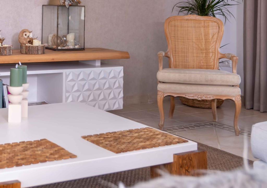 The entrance floor of the villa is comprised of a fully equipped kitchen and a bright and spacious living area, that leads seamlessly to the outdoor dining terrace, private garden and pool area. The outdoor area offers ample space for dining, relaxation and entertainment in a tranquil and private setting.