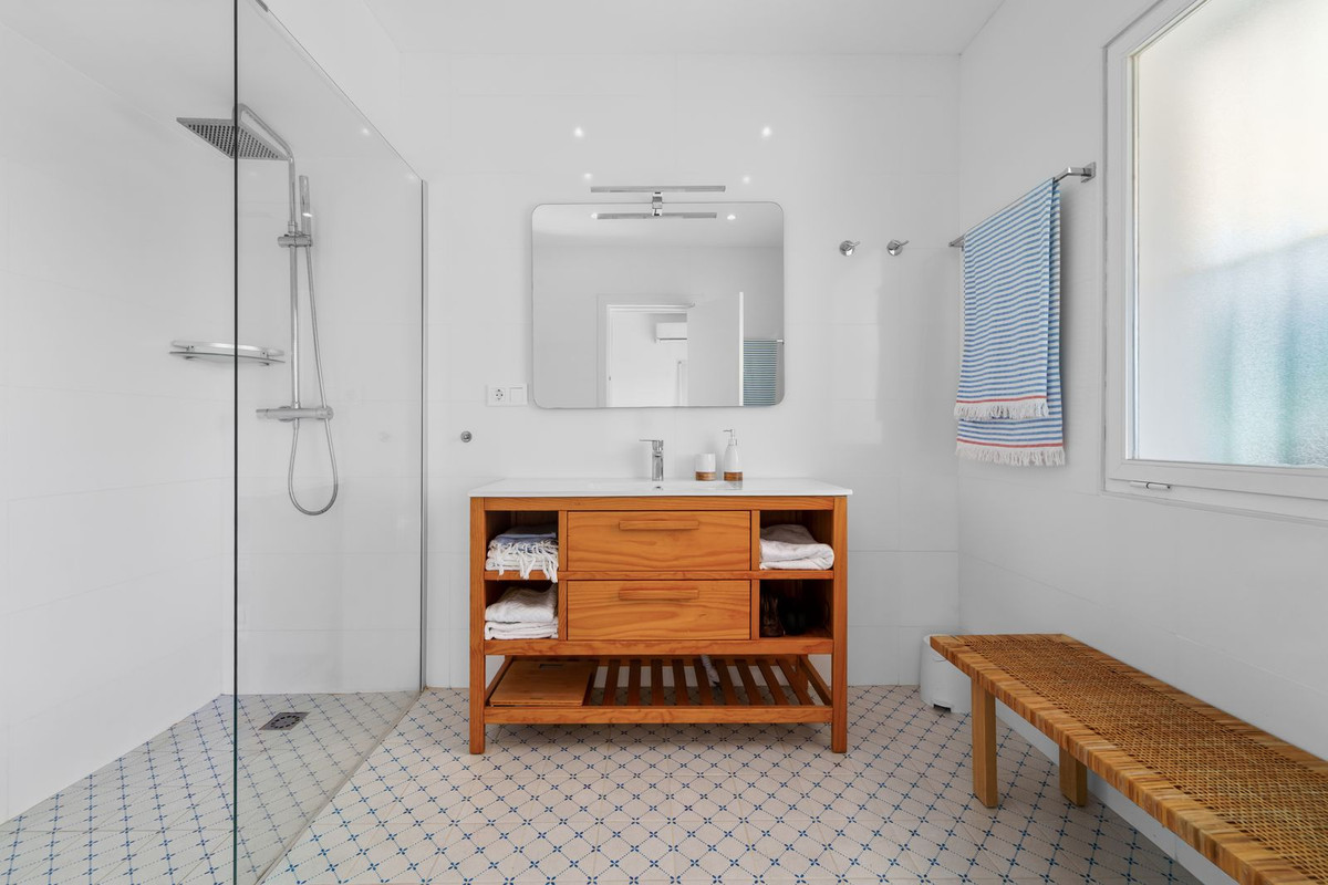 Cette propriété offre cinq chambres spacieuses, dont trois s'ouvrent sur un jardin luxuriant grâce à de grandes baies vitrées coulissantes, créant ainsi une transition harmonieuse entre intérieur et extérieur. Toutes les salles de bains ont été rénovées avec goût et sont équipées de douches, offrant une ambiance moderne et raffinée.