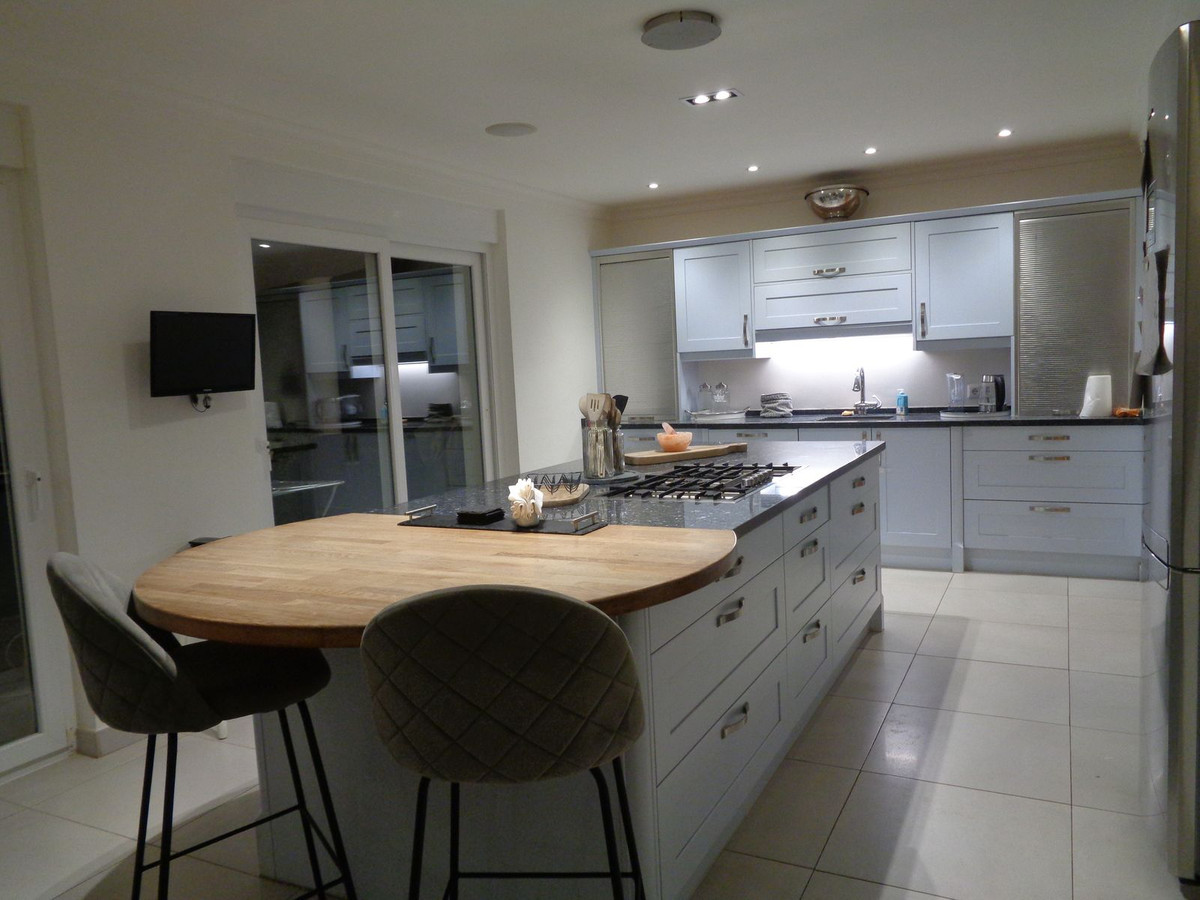 A beautiful dining area is between the lounge and the kitchen. Moving into the spacious kitchen which has a large centre island/breakfast bar with modern utilities and appliances. The kitchen is a very welcoming space which is also flooded with light having three sets of double patio doors leading out to the terraces, gardens and swimming pool.
