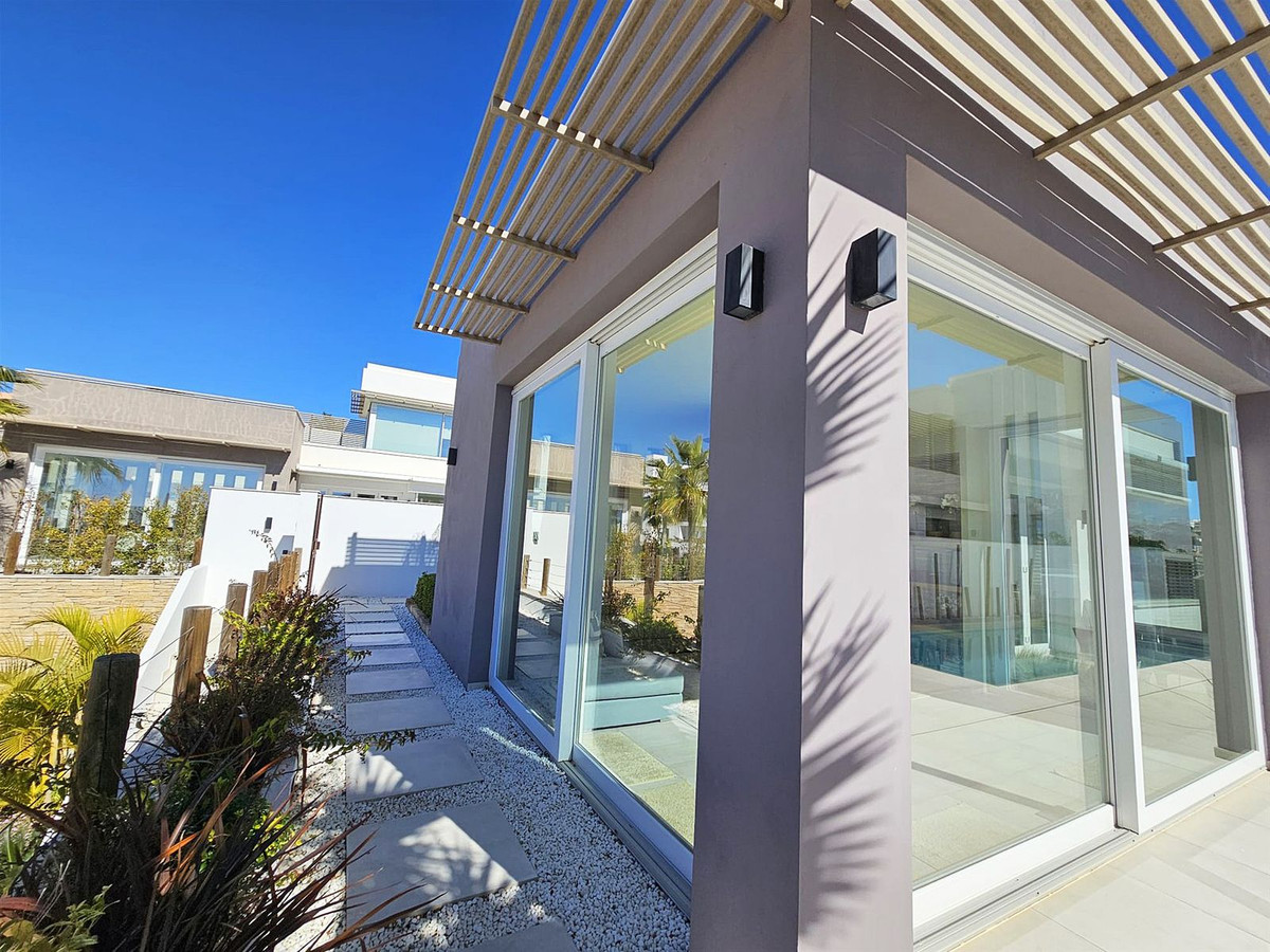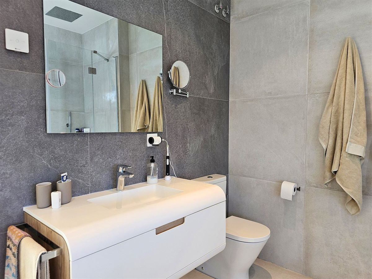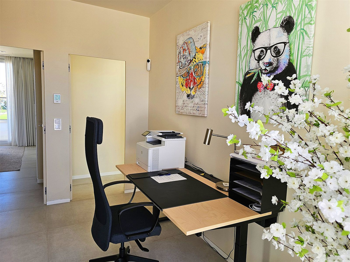 Upstairs, on the first floor, the landing is currently set up as a home office and leads out to a large terrace. Two further en-suite bedrooms are located on this floor, including the master suite, which enjoys particularly striking sea and golf views, a walk-in closet, and direct access to the terrace. The master bathroom features both a bathtub and separate shower.