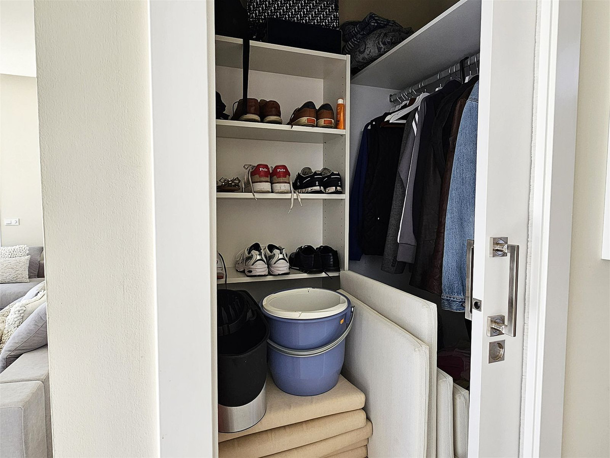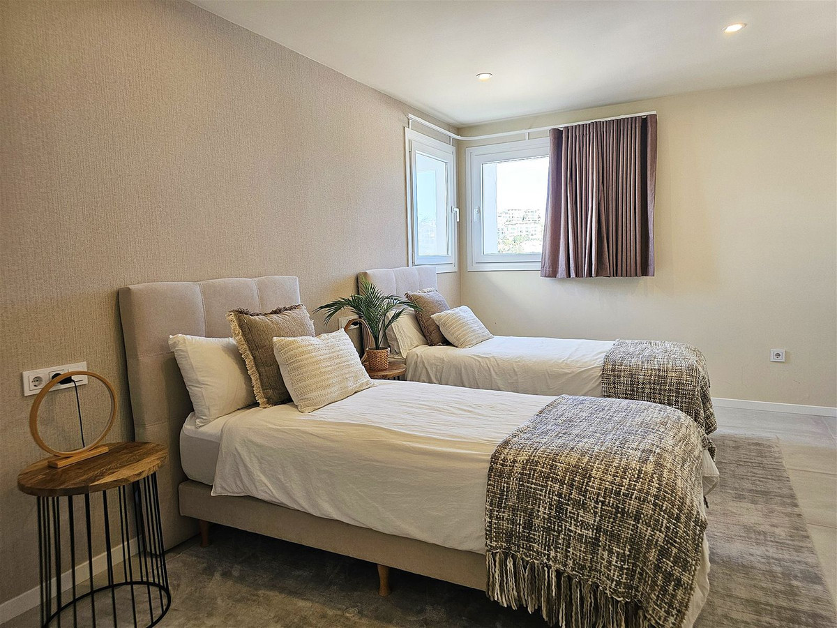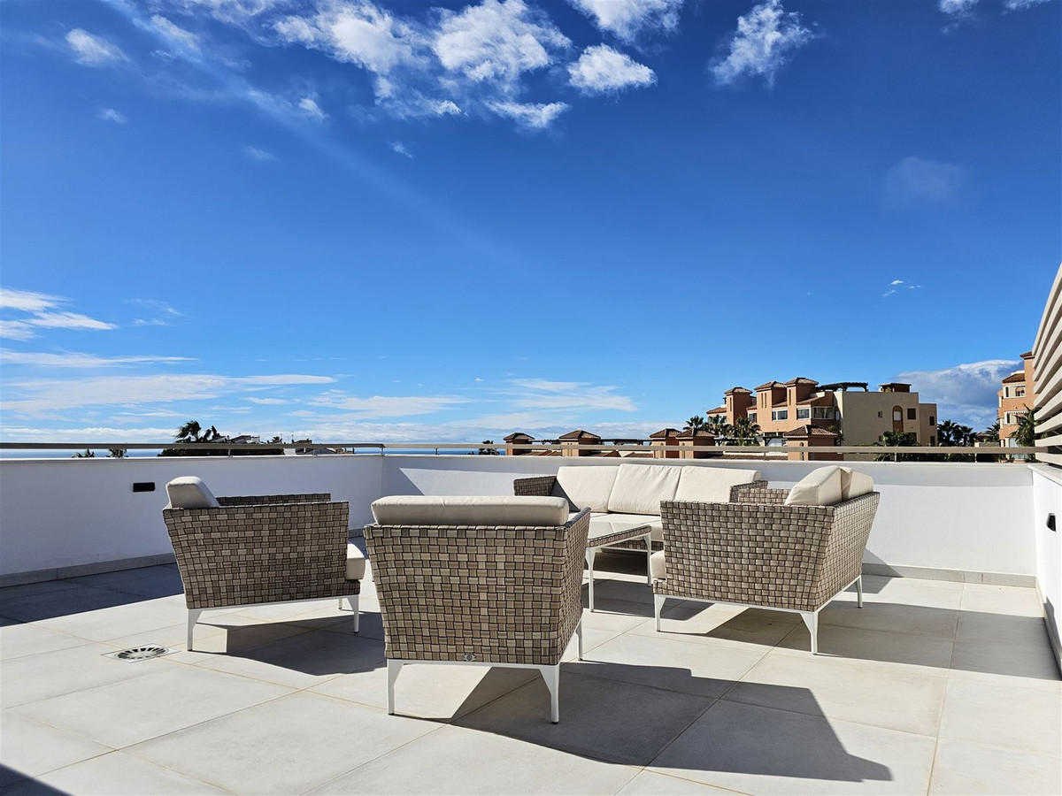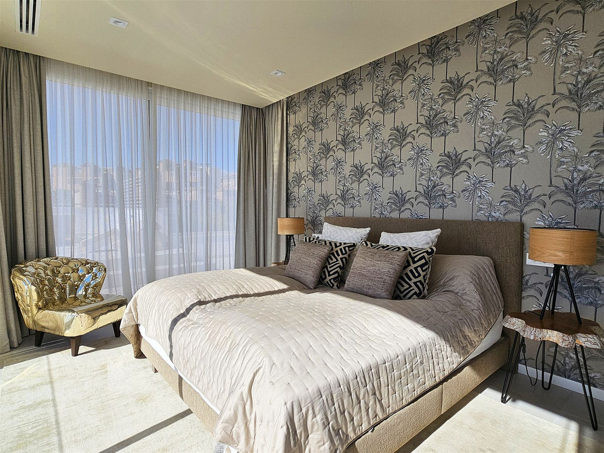 Upstairs, on the first floor, the landing is currently set up as a home office and leads out to a large terrace. Two further en-suite bedrooms are located on this floor, including the master suite, which enjoys particularly striking sea and golf views, a walk-in closet, and direct access to the terrace. The master bathroom features both a bathtub and separate shower.