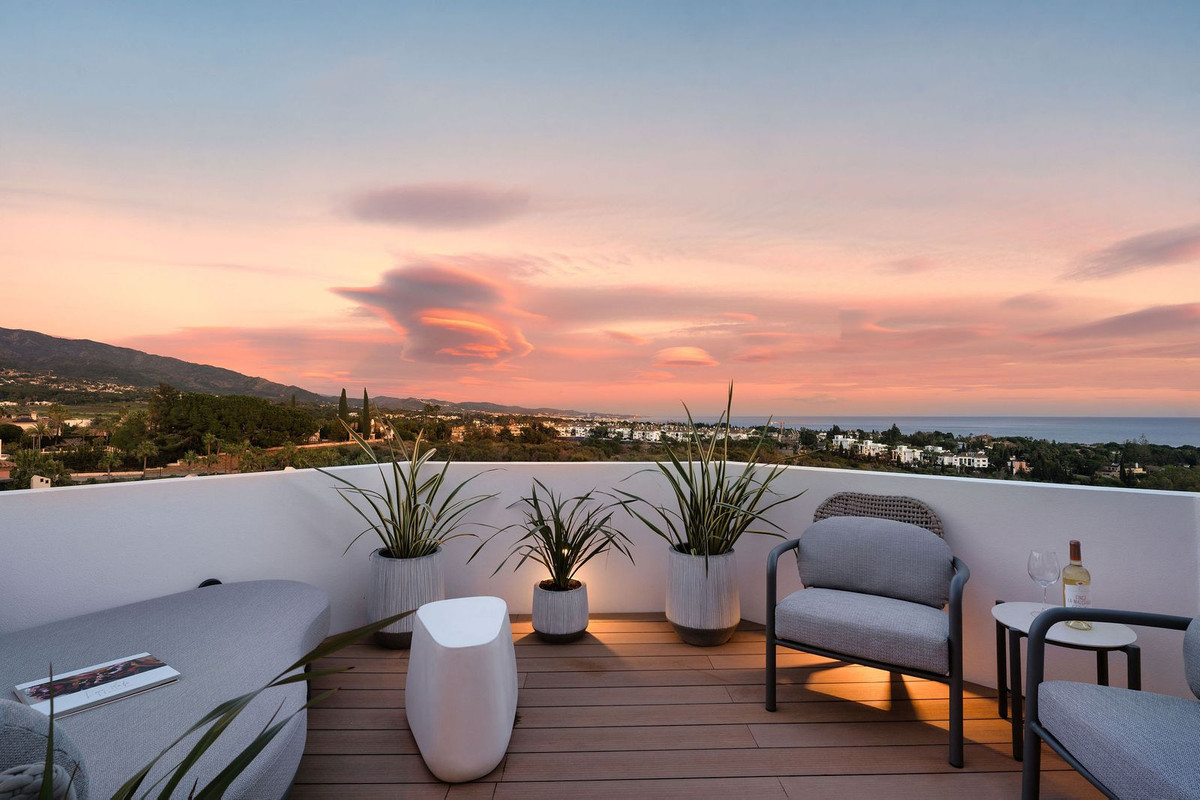 Set within the prestigious Golden Mile, this exquisite fully renovated duplex penthouse in the sought-after Coto Real is a rare blend of elegance, comfort, and breathtaking scenery. South-facing and bathed in natural light throughout the day, the property enjoys panoramic sea and mountain views that unfold from sunrise. The interiors have been carefully redesigned using high-standard materials and finished in warm, subtle tones, creating a refined yet inviting atmosphere that feels both luxurious and timeless. The penthouse offers three beautifully appointed bedrooms, the master has a walk-in closet and a private west facing terrace, two stylish bathrooms, and an additional guest toilet, perfectly laid out over two levels to ensure privacy and functionality. Every space flows effortlessly, enhancing the sense of openness while framing the stunning Mediterranean and surrounding mountain landscape. A truly exceptional home for those seeking a turn-key luxury residence in one of Marbella’s prime locations—where sophisticated design meets unforgettable views.