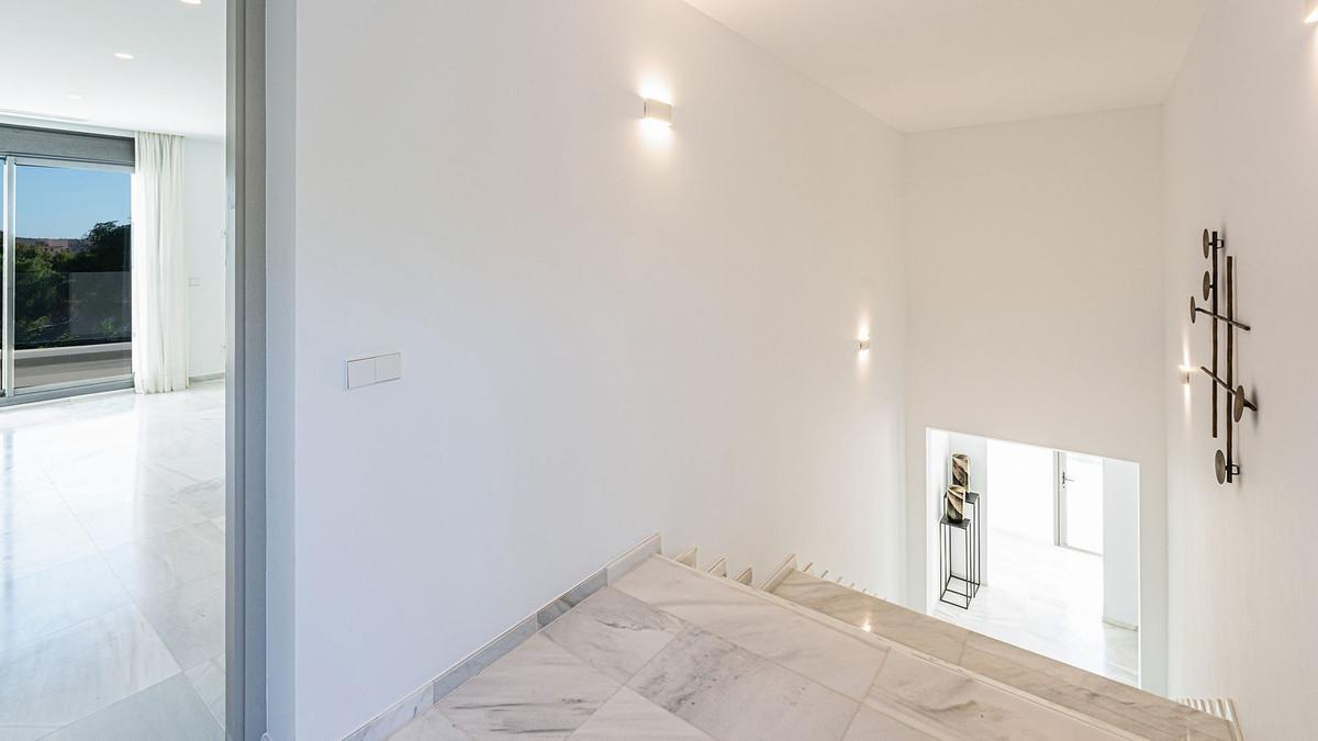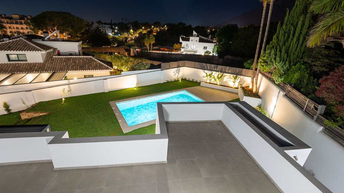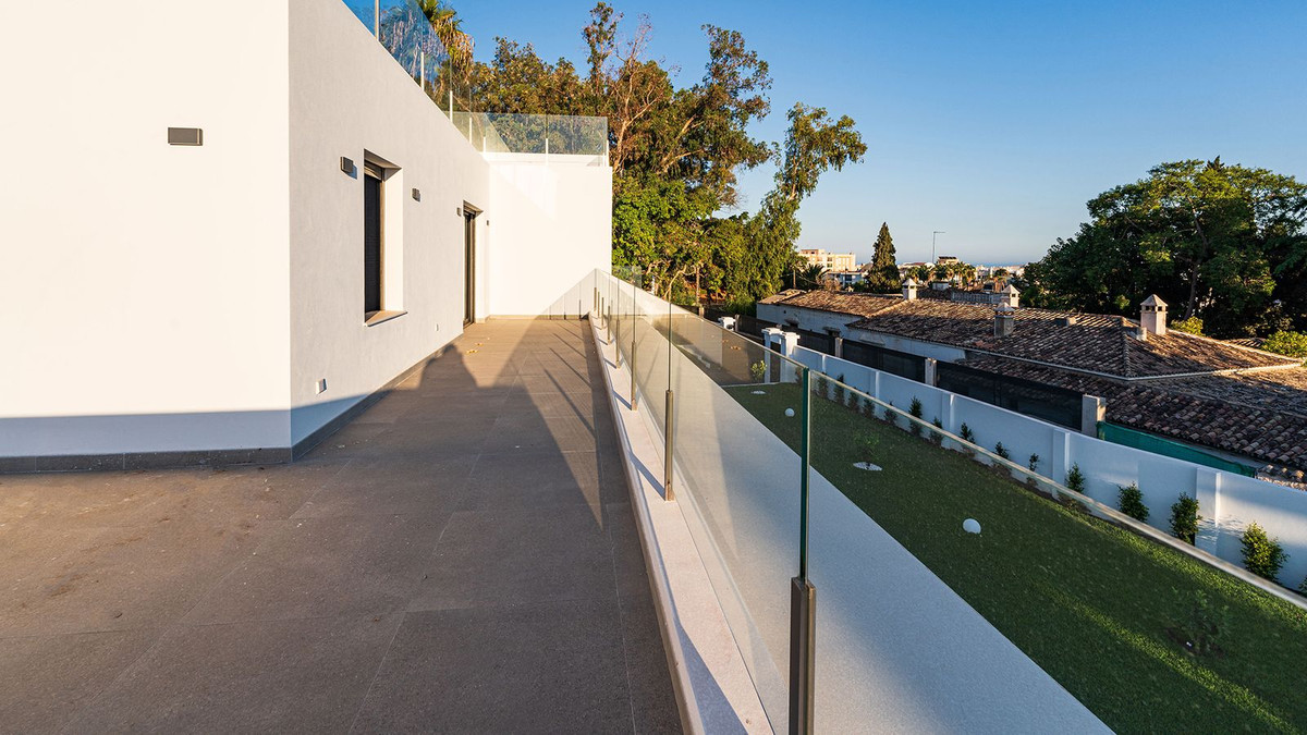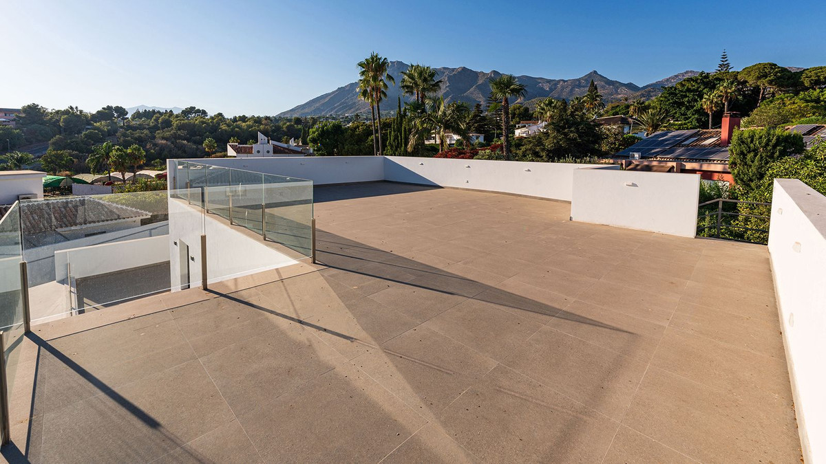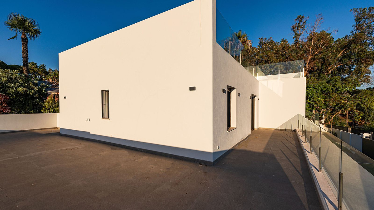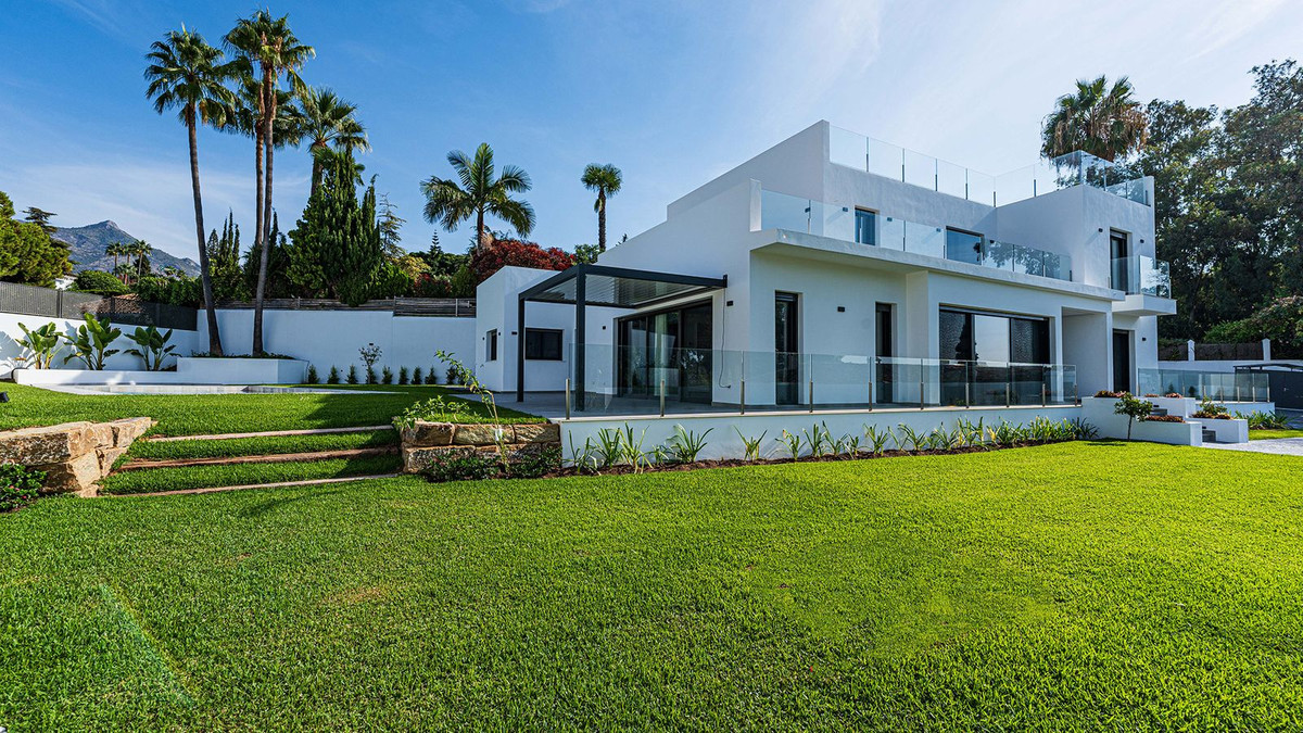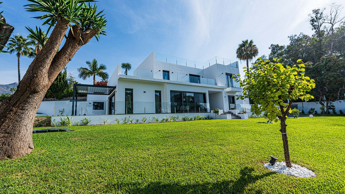 Built in 2024, this unique property combines privacy, elegance, contemporary design, and an unbeatable location, just minutes from the beach and premium amenities. With a 1,485 m² plot and 420 m² of living space, this villa offers spaciousness, natural light, and maximum comfort. Distributed over three floors, the ground floor comprises a grand entrance hall, a magnificent living-dining room with several distinct areas seamlessly integrated with the outdoors thanks to its large windows connecting the spacious terraces, the pool, and the garden, a guest toilet, a fully furnished and equipped kitchen, laundry room, a staff bedroom with en-suite bathroom adjacent to the kitchen, and two spacious bedrooms with two en-suite bathrooms. The first floor features a large master suite with access to a spacious terrace, comprising a large bedroom, dressing area, and bathroom, plus another bedroom with an en-suite bathroom. The third floor features a large solarium terrace with panoramic views of Marbella. Large parking area inside the plot.