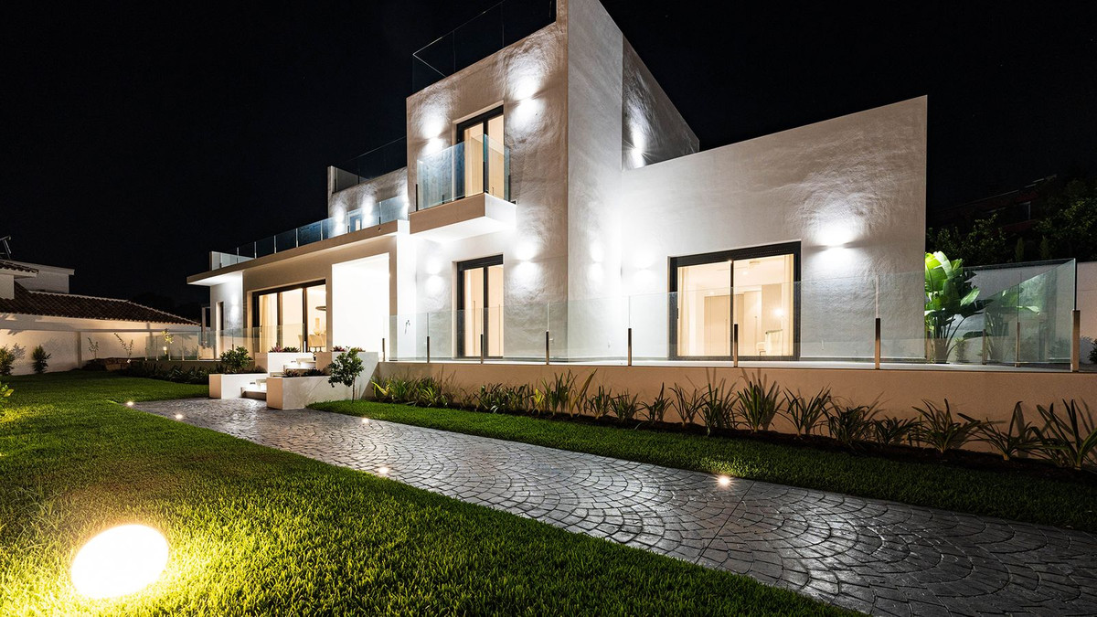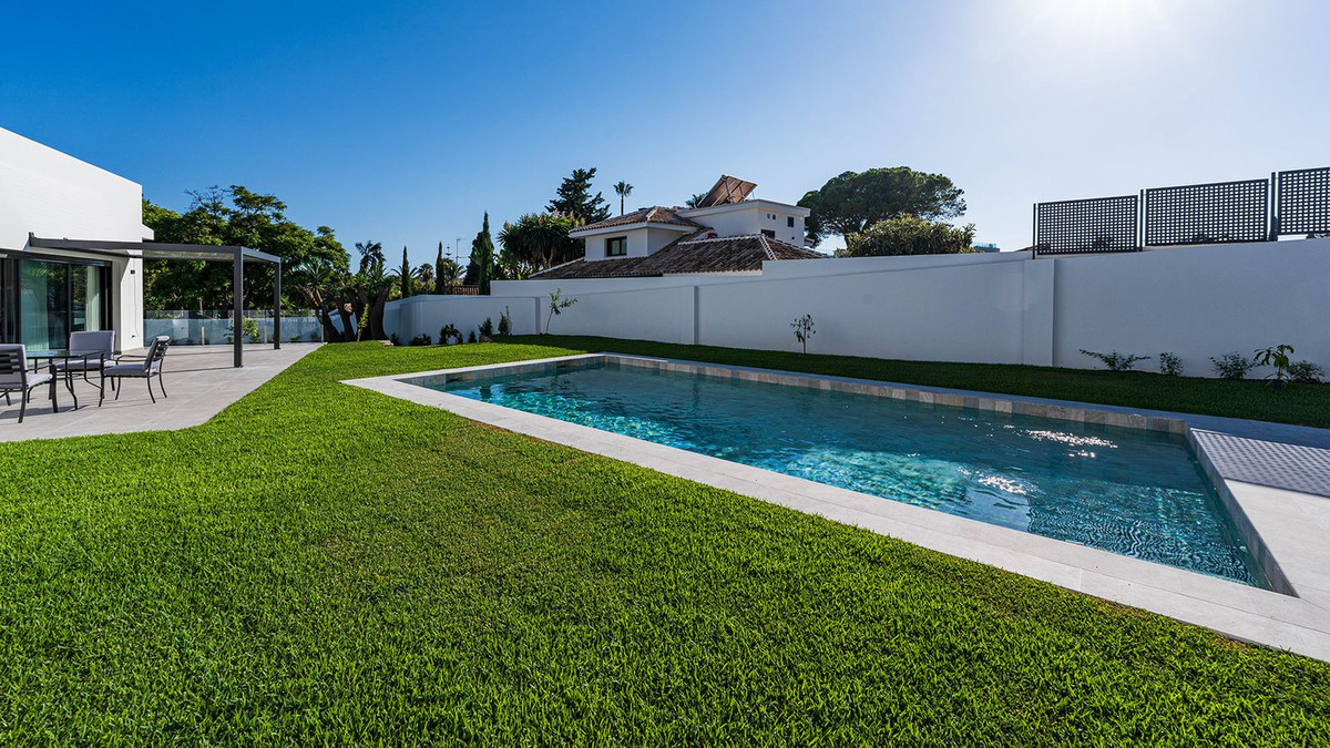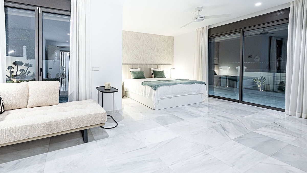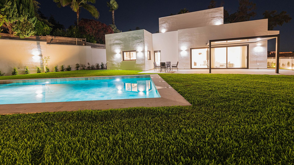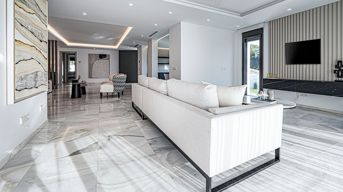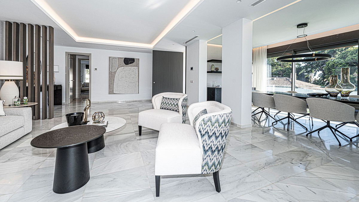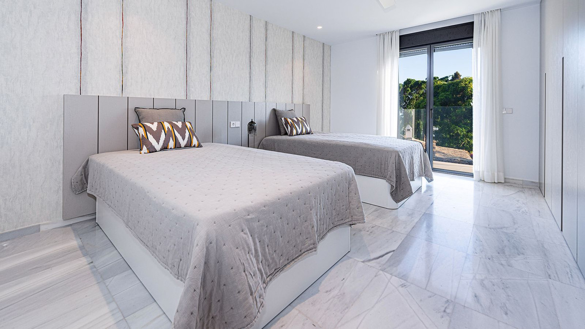 Built in 2024, this unique property combines privacy, elegance, contemporary design, and an unbeatable location, just minutes from the beach and premium amenities. With a 1,485 m² plot and 420 m² of living space, this villa offers spaciousness, natural light, and maximum comfort. Distributed over three floors, the ground floor comprises a grand entrance hall, a magnificent living-dining room with several distinct areas seamlessly integrated with the outdoors thanks to its large windows connecting the spacious terraces, the pool, and the garden, a guest toilet, a fully furnished and equipped kitchen, laundry room, a staff bedroom with en-suite bathroom adjacent to the kitchen, and two spacious bedrooms with two en-suite bathrooms. The first floor features a large master suite with access to a spacious terrace, comprising a large bedroom, dressing area, and bathroom, plus another bedroom with an en-suite bathroom. The third floor features a large solarium terrace with panoramic views of Marbella. Large parking area inside the plot.