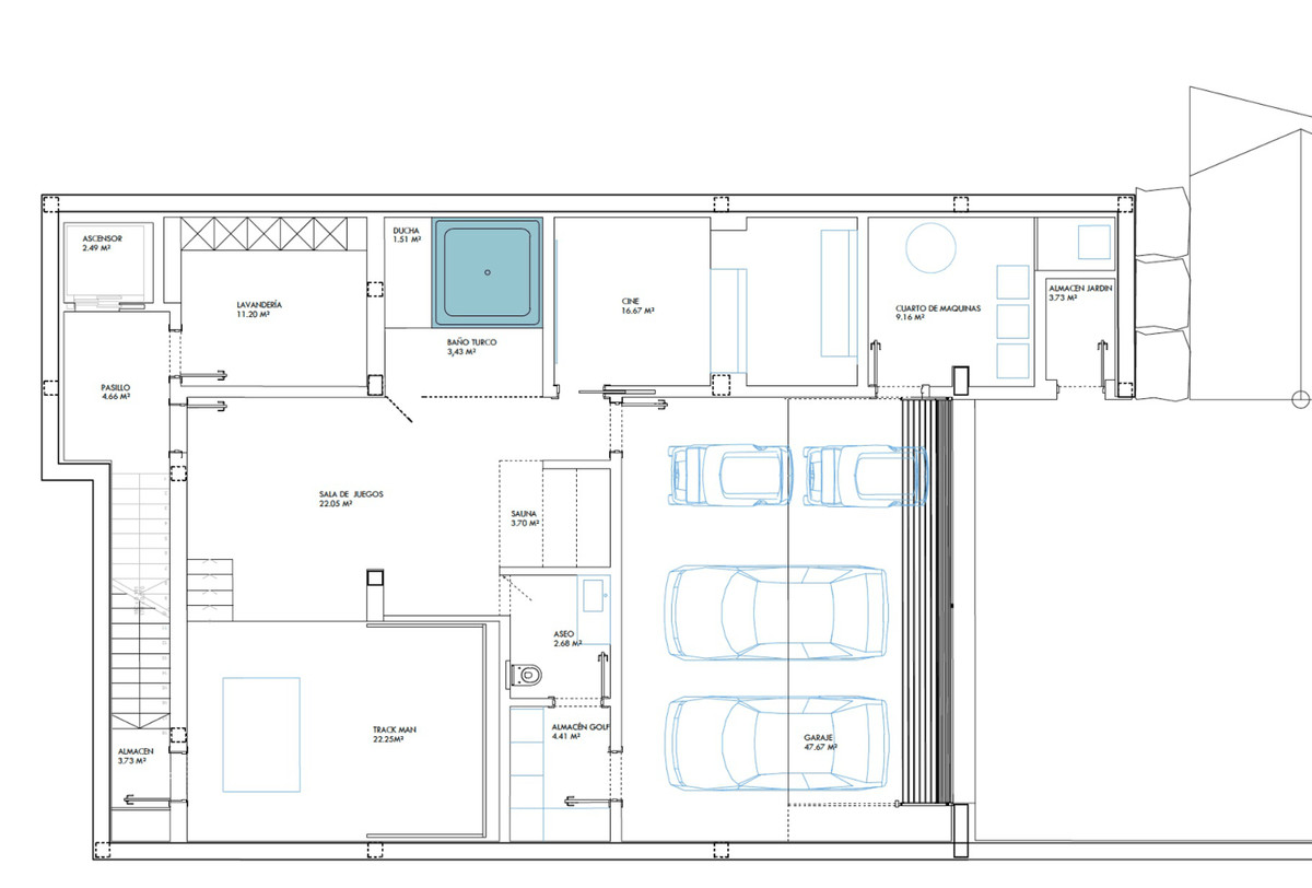 The lower level is dedicated to leisure and wellness, including a pre-installation for a Trackman golf simulator, sauna, cold plunge, fully equipped laundry, and ample storage. The garage accommodates three cars, with additional technical and storage rooms.