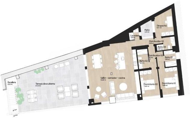 From the living area there is direct access to a spectacular 70-square-meter terrace, a true luxury in such a central location. This outdoor space offers multiple possibilities: a relaxation area, an outdoor dining space or a landscaped area, ideal for enjoying the climate and special moments in a private setting.