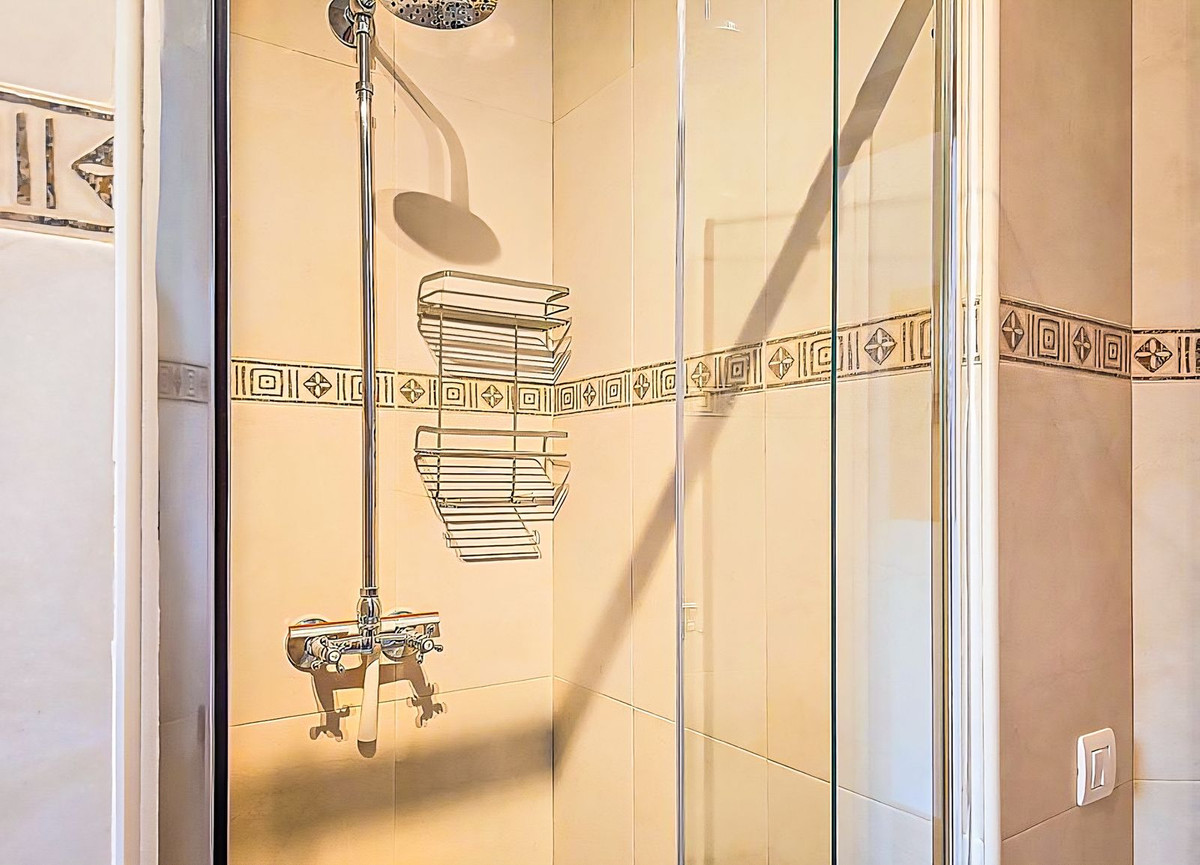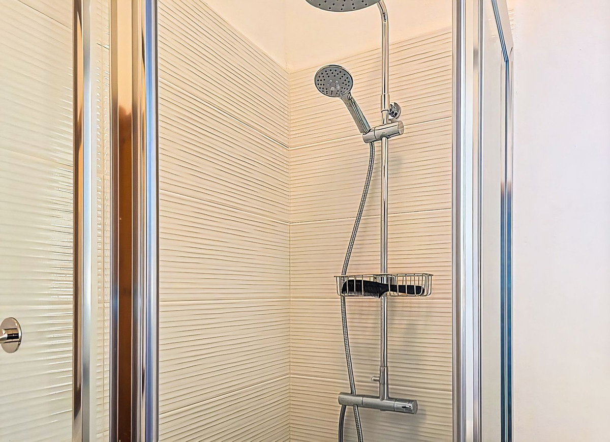 The separate guest apartment, accessed via steps from the pool terrace, offers privacy and flexibility for visiting family, friends, or rental opportunities. Its full-length terrace, bordered by mature citrus trees and Mediterranean planting, enjoys the same spectacular sea and village views. Inside, the apartment features an open-plan kitchen and dining area with a lounge subtly divided by a bookcase (3.5m x 6.5m). Glazed patio doors and a large floor-to-ceiling window fill the space with natural light. There is also a double bedroom (2.8m x 3.2m) with patio doors opening onto the terrace, and a shower room (1.9m x 1.5m).