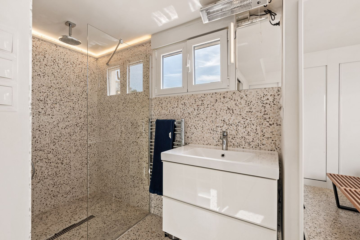 The heart of the home is the exceptionally spacious living room, which opens directly onto a large terrace with panoramic sea views. Thanks to its wide sliding glass doors and excellent orientation, the space is flooded with natural light and offers seamless indoor-outdoor living. From the terrace you can enjoy stunning views of the Mediterranean and the surrounding coastline.