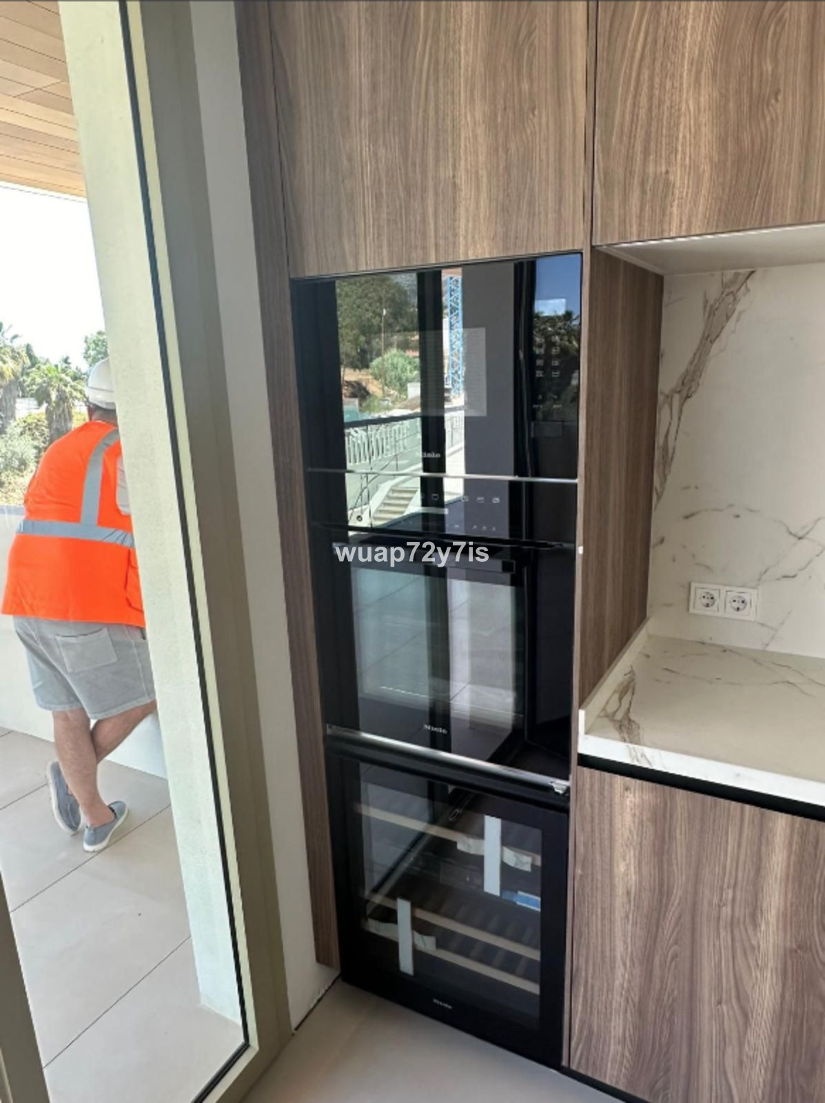 Inside, the apartment showcases impeccable craftsmanship and high-end contemporary design. The fully equipped designer kitchen features premium appliances by Miele, including a double American-style refrigerator, wine cooler, washing machine, and dryer. Every element has been carefully selected to combine functionality with refined aesthetics.