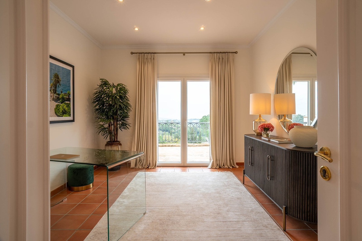 L'hébergement comprend trois chambres spacieuses avec salle de bains privative, ainsi qu'une pièce polyvalente pouvant servir de chambre, de chambre d'enfant, de bureau ou de salon. Une bibliothèque séparée offre une flexibilité supplémentaire et peut facilement être transformée en chambre ou en espace de travail. La suite principale dispose d'un dressing et offre une vue imprenable sur le paysage environnant.