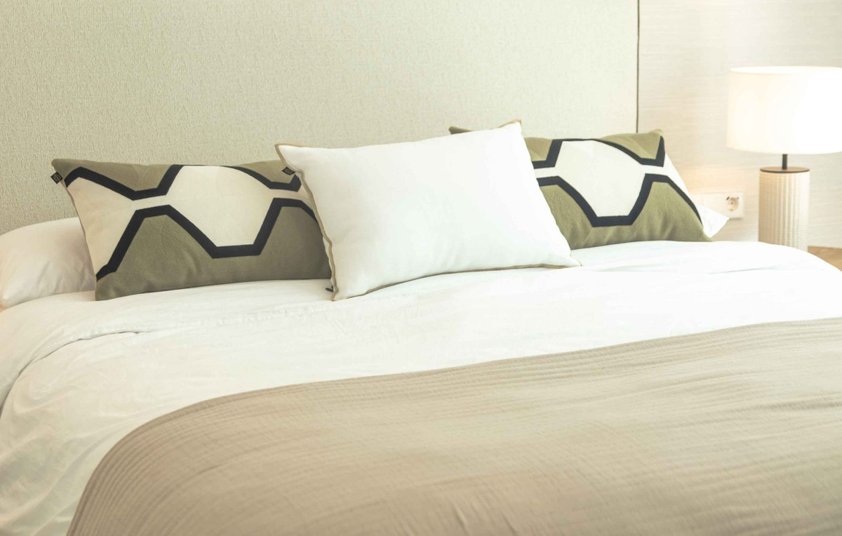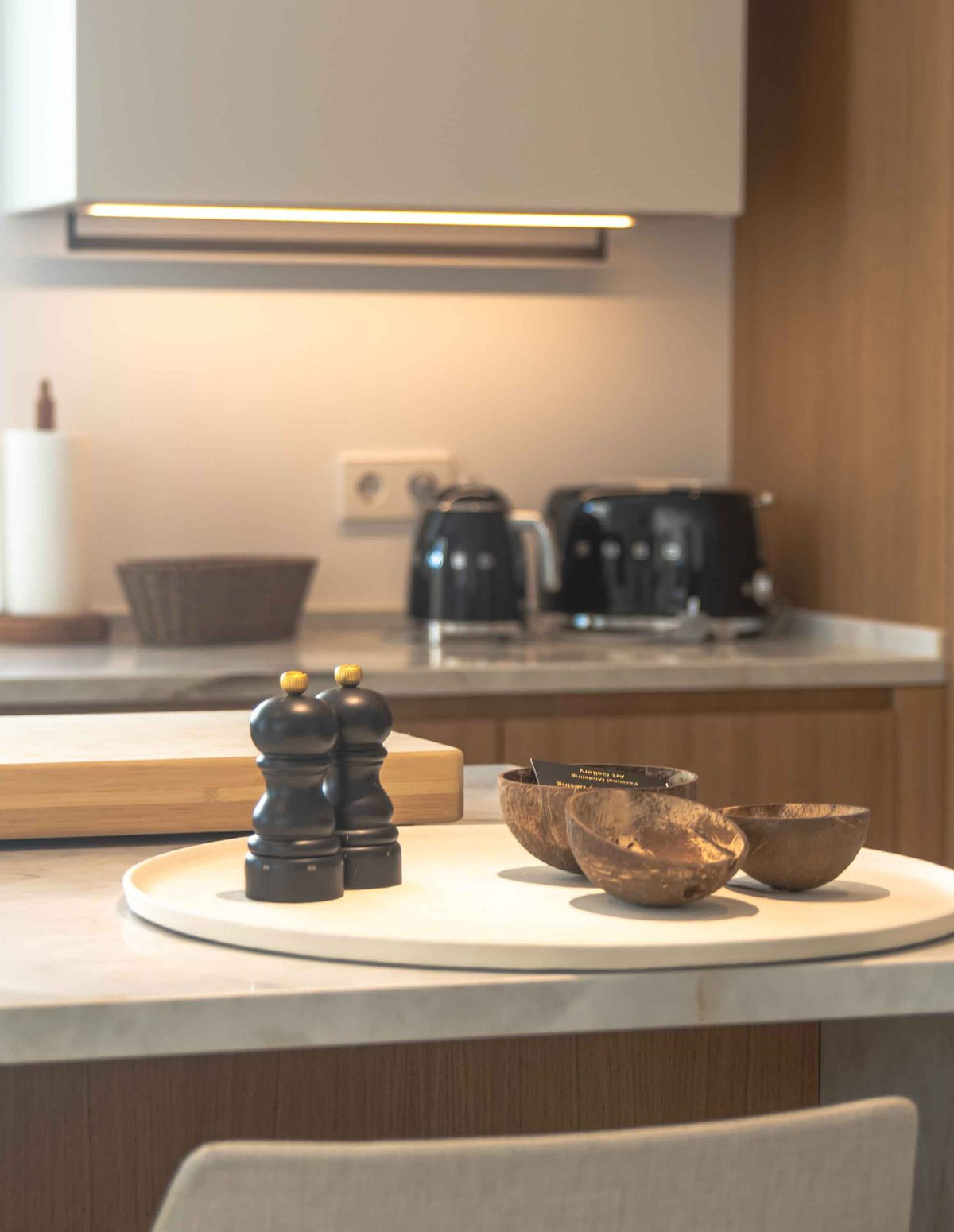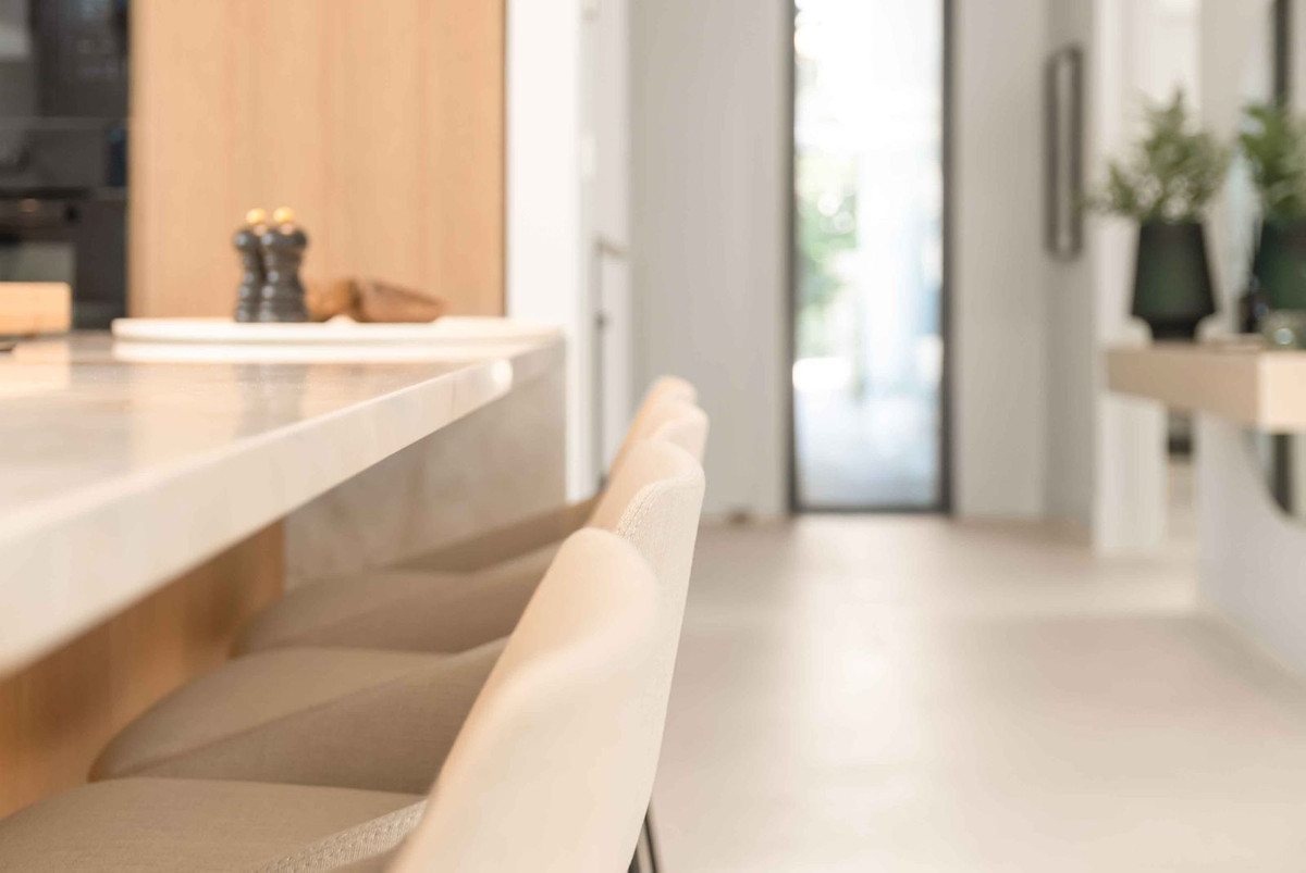 L'espace de vie principal se présente comme un espace ouvert où le salon, la salle à manger et la cuisine entièrement équipée communiquent visuellement et fonctionnellement. De larges baies vitrées coulissantes prolongent l'intérieur vers la terrasse, renforçant ainsi le lien entre intérieur et extérieur. La cuisine, dotée d'électroménagers intégrés et d'un îlot central, est conçue pour un usage quotidien et pour recevoir. Des détails subtils au plafond et l'harmonie des matériaux contribuent à une circulation spatiale sereine et cohérente.