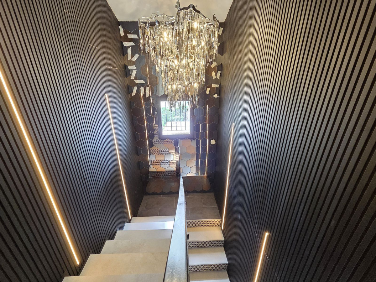 En entrant dans la propriété, vous découvrirez une cuisine luxueuse sur mesure, conçue spécialement pour le propriétaire (elle sera démontée et emportée avec lui lors de son départ). Cet espace peut être réaménagé en pièce à vivre avec cuisine intégrée. Un espace de rangement sous l'escalier abrite le lave-linge.