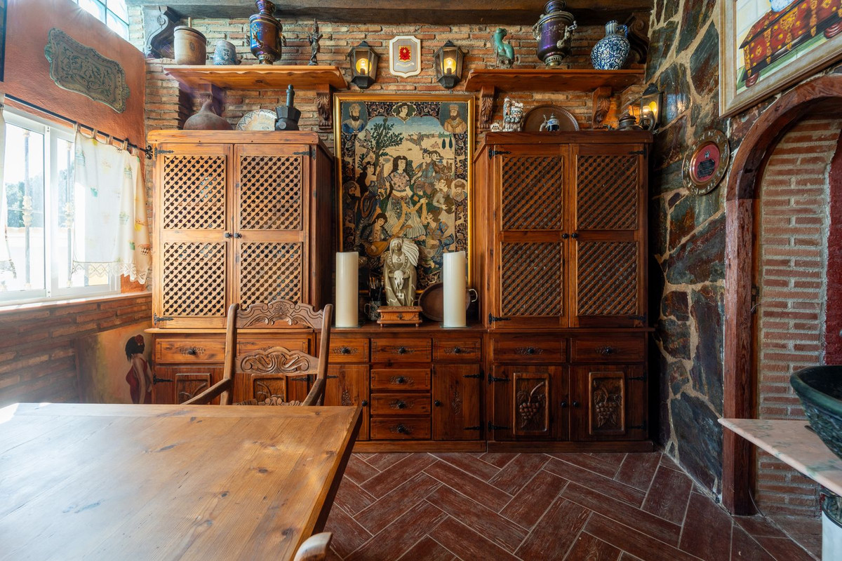 Dès l'arrivée, l'entrée principale, encadrée par deux garages spacieux, donne sur une charmante terrasse privée conçue dans le style d'une cour andalouse traditionnelle. Entouré de pots de fleurs colorés et d'authentiques céramiques de Grenade, cet espace paisible invite à la détente et à profiter de l'atmosphère sereine qui caractérise cette demeure unique. Un porche accueillant, soutenu par d'élégantes colonnes, mène à l'intérieur, dévoilant le caractère et le charme de la villa.