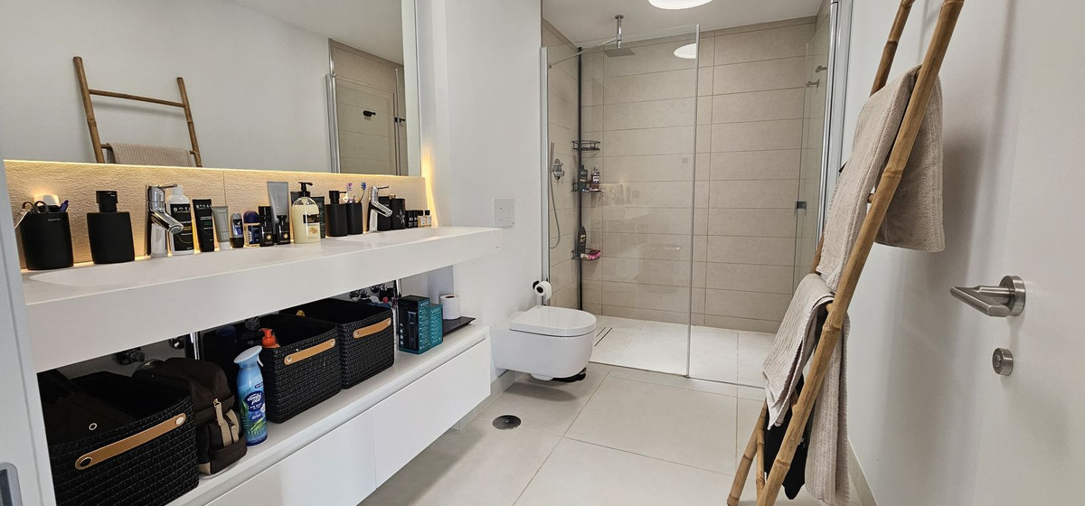 L'appartement bénéficie d'un accès pratique par un escalier et un ascenseur direct depuis le garage, desservant exclusivement l'intérieur. Dès l'entrée, vous découvrirez un séjour-salle à manger spacieux et lumineux, doté d'une cuisine américaine entièrement équipée d'électroménager haut de gamme. Attenante à la cuisine se trouve une buanderie fonctionnelle avec lave-linge, sèche-linge et système de chauffage aérothermique.