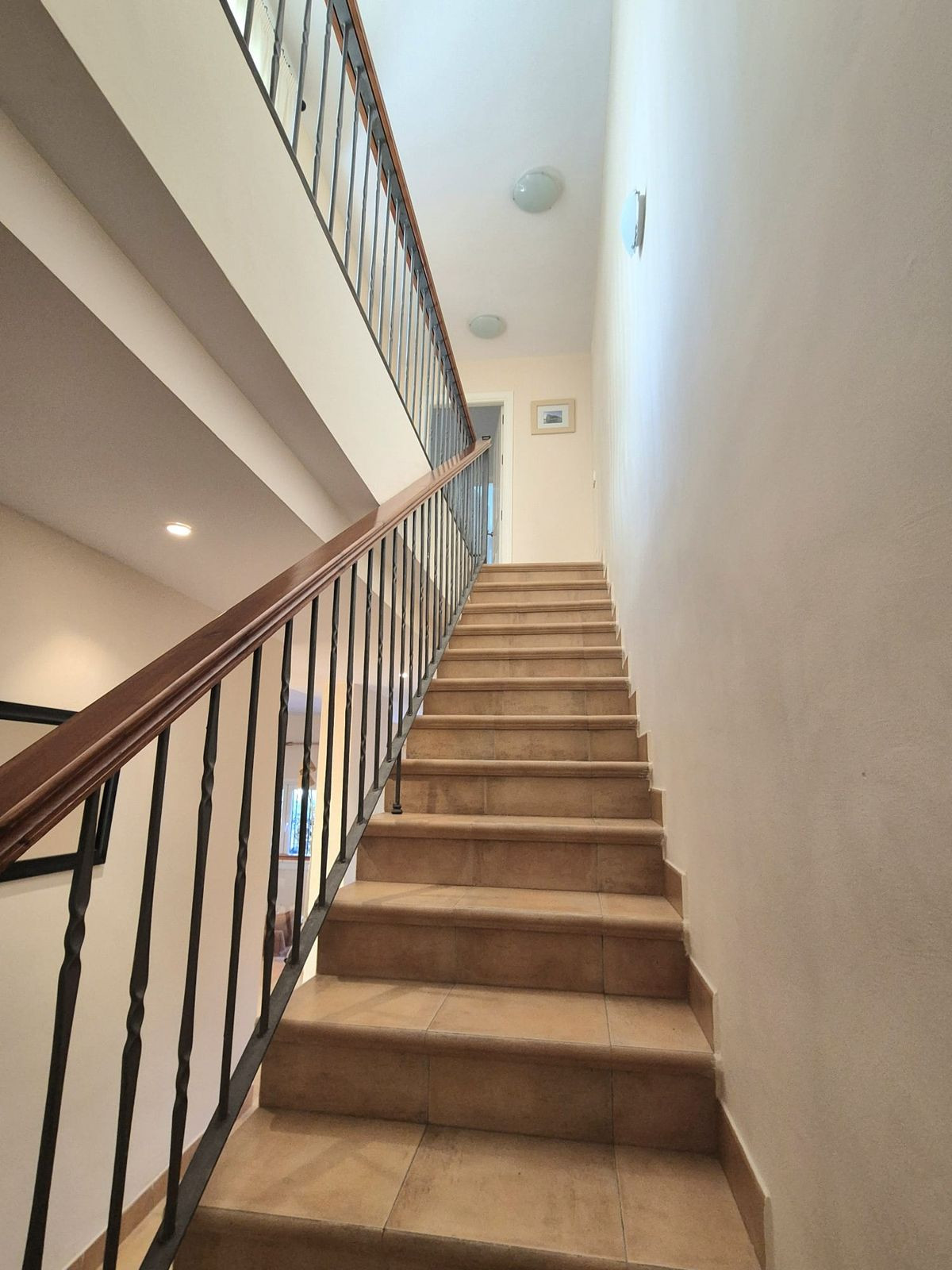 Au deuxième étage se trouve la chambre principale avec deux placards intégrés, la climatisation et une salle de bains privative avec baignoire/douche. Viennent ensuite deux autres chambres doubles, chacune équipée de placards intégrés et de la climatisation, qui partagent une salle de bains complète. Toutes les salles de bains sont dotées de fenêtres.
